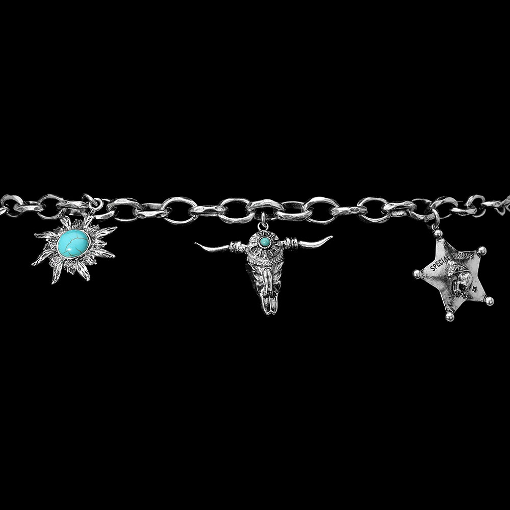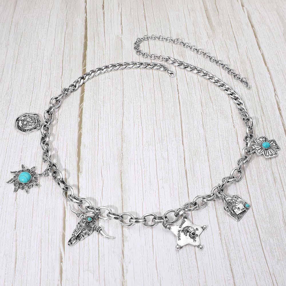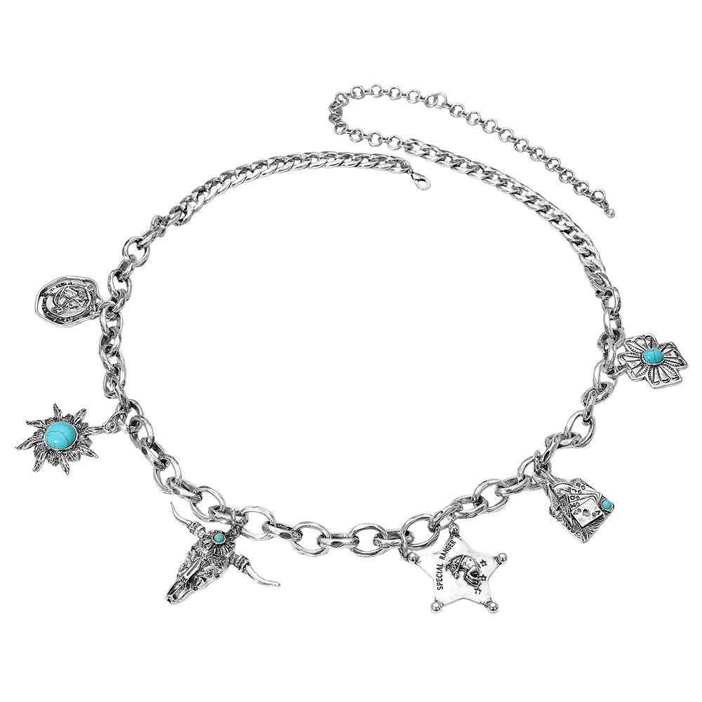 • This Western-inspired chain waist belt features intricate charms including floral, star, and bull head motifs accented with turquoise-like details. Its adjustable design ensures a comfortable fit, making it the perfect statement accessory for elevating casual or boho-chic outfits.