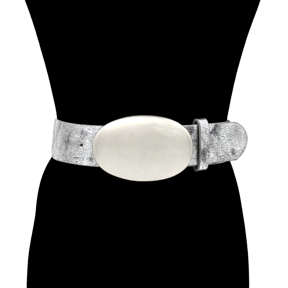• This oval buckle statement belt combines bold design with refined elegance. Featuring a sleek wide band and a smooth, polished buckle, it adds a sophisticated accent to any outfit. Perfect for cinching the waist or enhancing casual and dressy looks with timeless appeal.