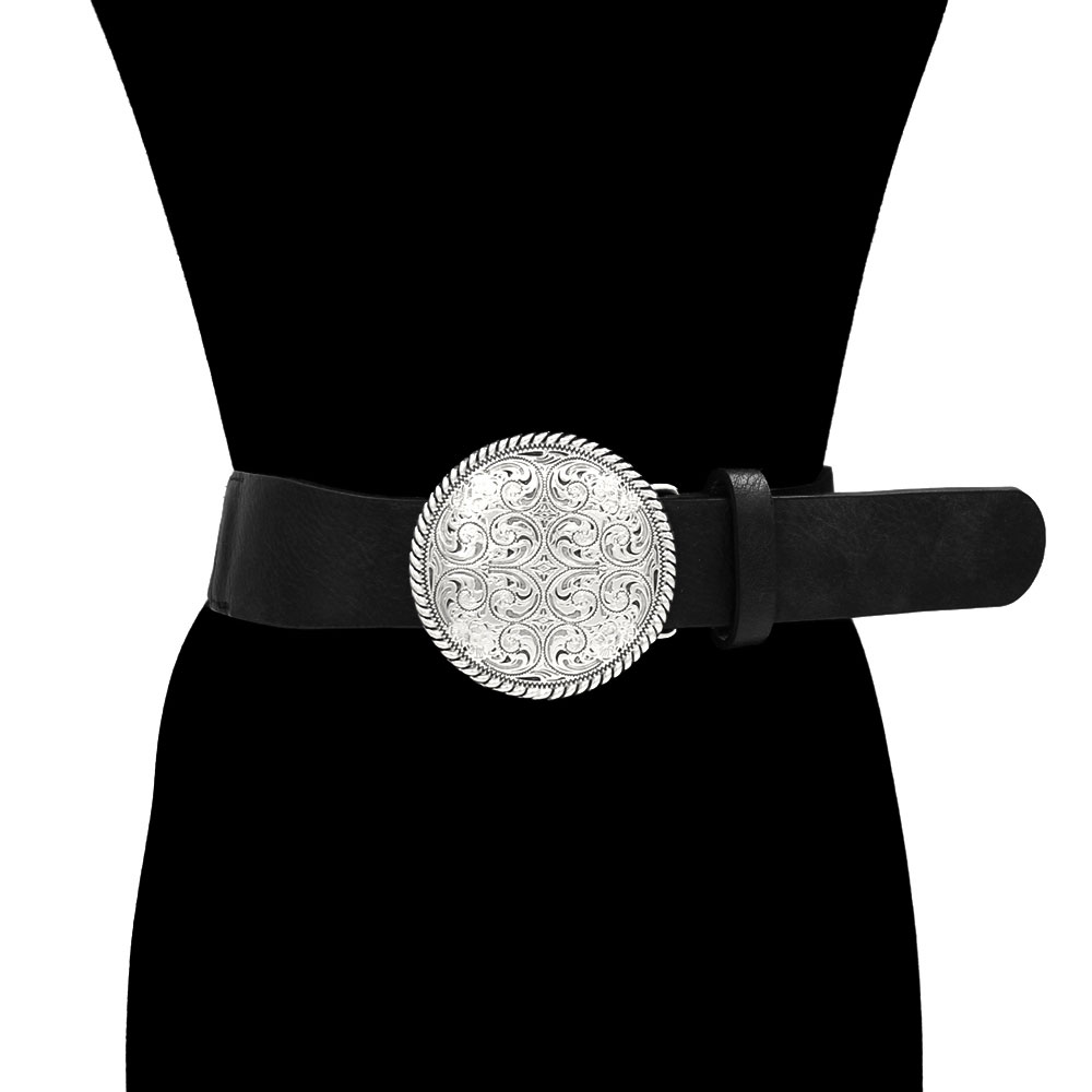 • This round embossed buckle waist belt blends classic design with elegant detail. The ornate circular buckle adds refined charm, making it ideal for accentuating both casual and dressy outfits. A statement accessory that brings timeless sophistication to any look.