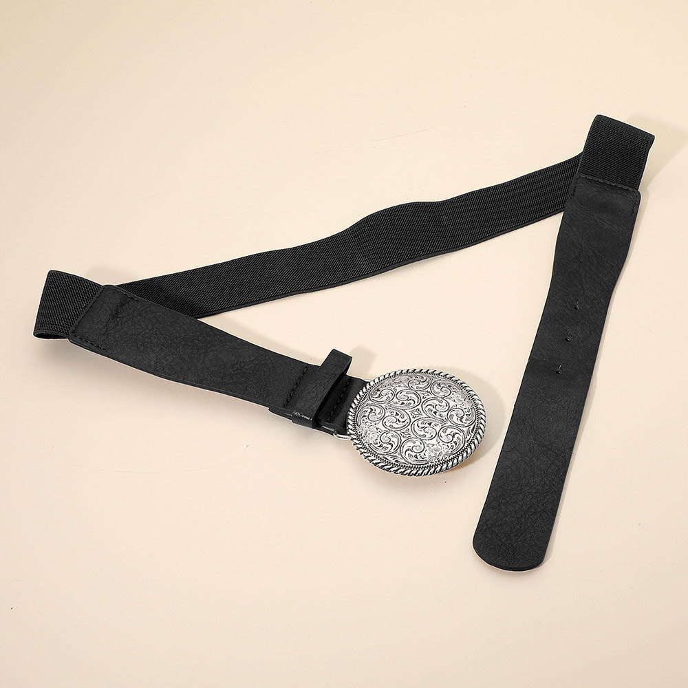 Bold Embossed Round Buckle Accent Elastic Waist Belt