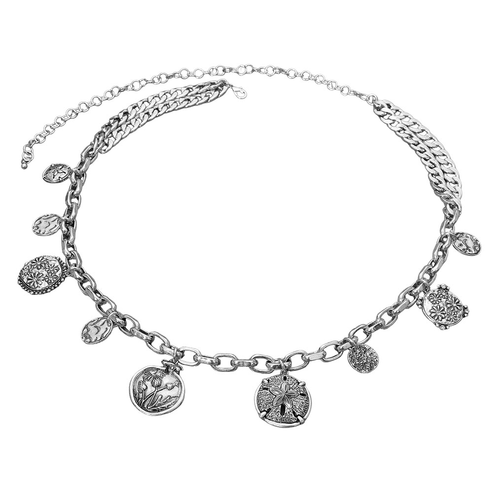 Details • Size : 2" H, 31" + 13" L • Stylish chunky chain belt adorned with embossed coin charms for a statement look. Adjustable length with secure clasp closure, perfect for accentuating the waist over dresses, tunics, or skirts. A bold and fashionable accessory that adds elegance and character to any outfit. • Lead and Nickel Compliant