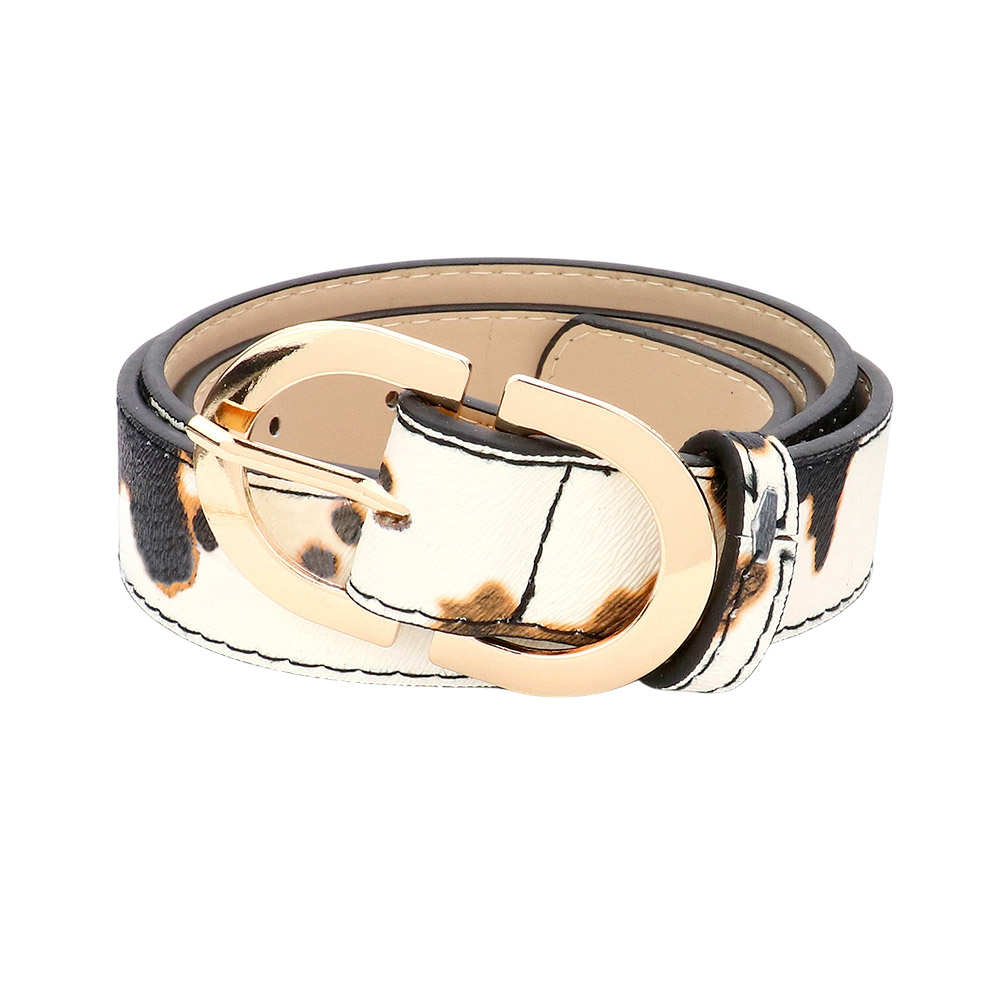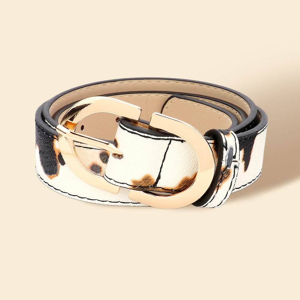 Details • Adjustable 28" - 38" L • Approximately 1.75" H X 40" L • Elevate everyday outfits with this chic cow pattern belt featuring a sleek round buckle design. Adjustable for a comfortable fit, this stylish waist accessory adds a playful yet sophisticated touch, making it perfect for jeans, skirts, or dresses. A must-have fashion staple.