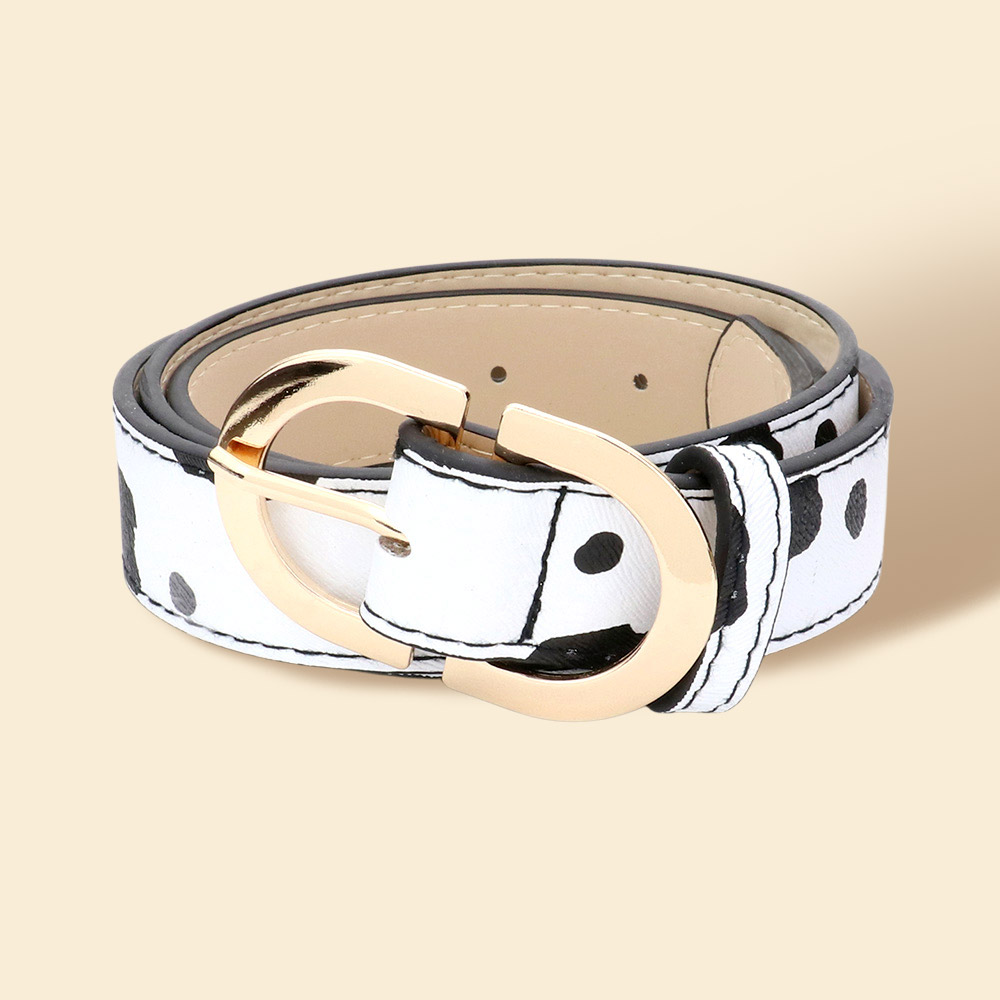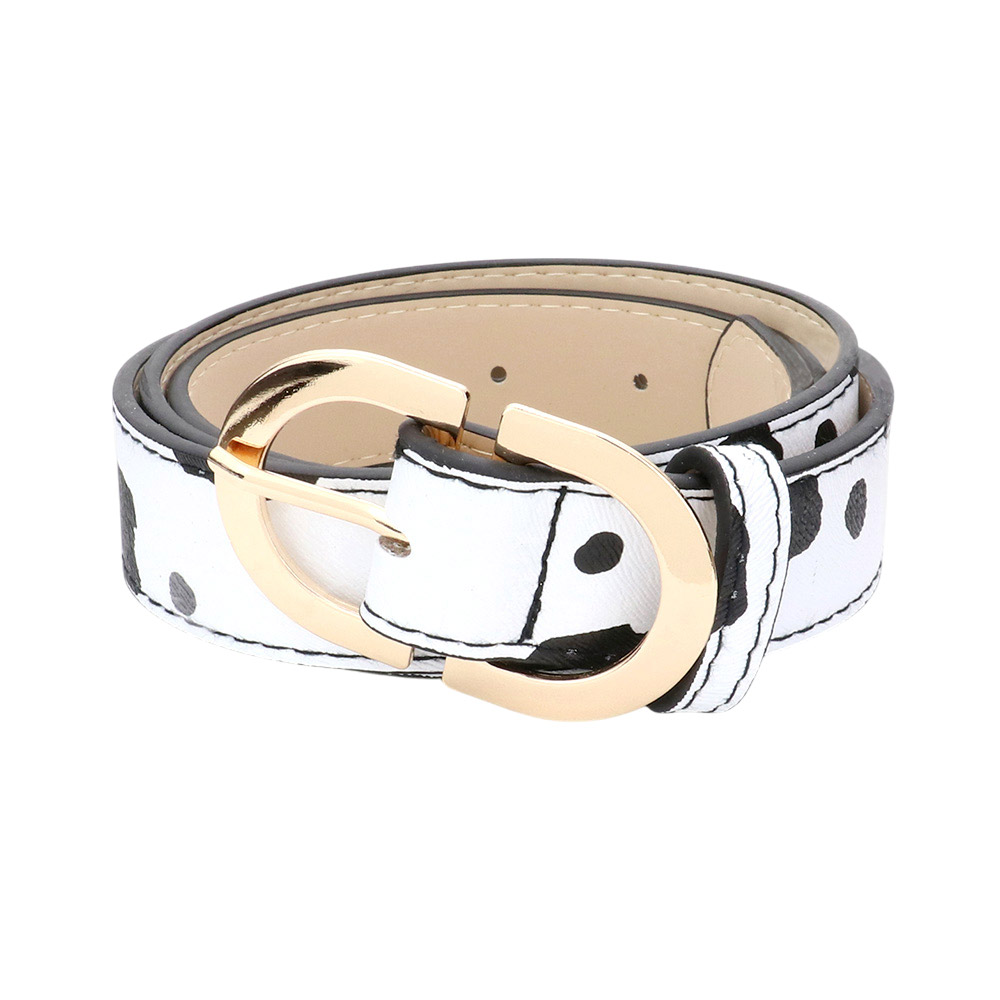 Details • Adjustable 28" - 38" L • Approximately 1.75" H X 40" L • Elevate everyday outfits with this chic cow pattern belt featuring a sleek round buckle design. Adjustable for a comfortable fit, this stylish waist accessory adds a playful yet sophisticated touch, making it perfect for jeans, skirts, or dresses. A must-have fashion staple.