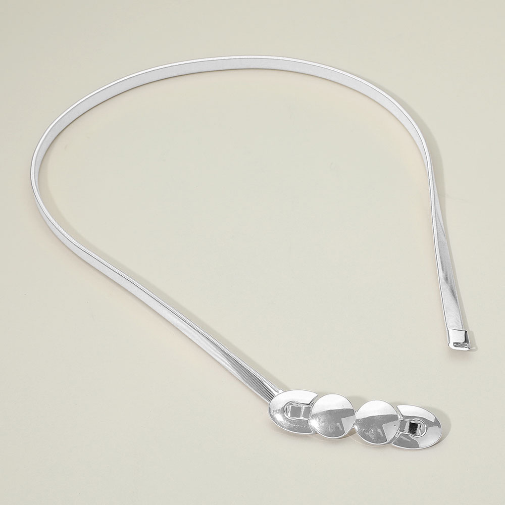 • Refine your silhouette with this elegant waist belt featuring a sleek strap and polished oval accents. Designed to enhance dresses and formalwear, this chic accessory adds a modern touch of sophistication, making it perfect for weddings, evening events, or elevating everyday looks.