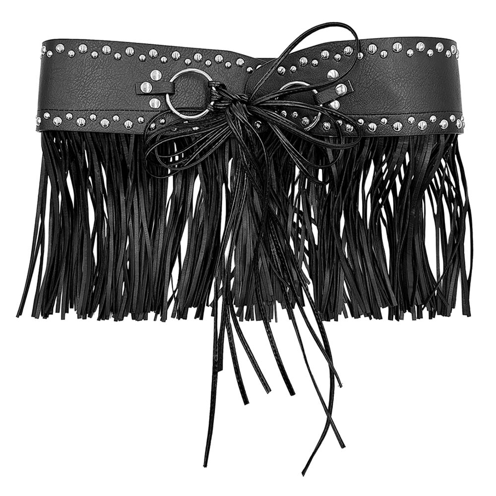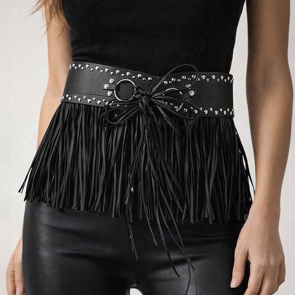Details • Size : 3.1" X 33.9" • Decor Size : 6.3" L • Material : 100% Polyester • This studded fringe waist belt features a bold lace-up center and flowing fringe design that adds movement and attitude to any outfit. Perfect for festival styling, statement layering, or boutique fashion collections, it defines the waist while delivering a standout, trend-forward look.