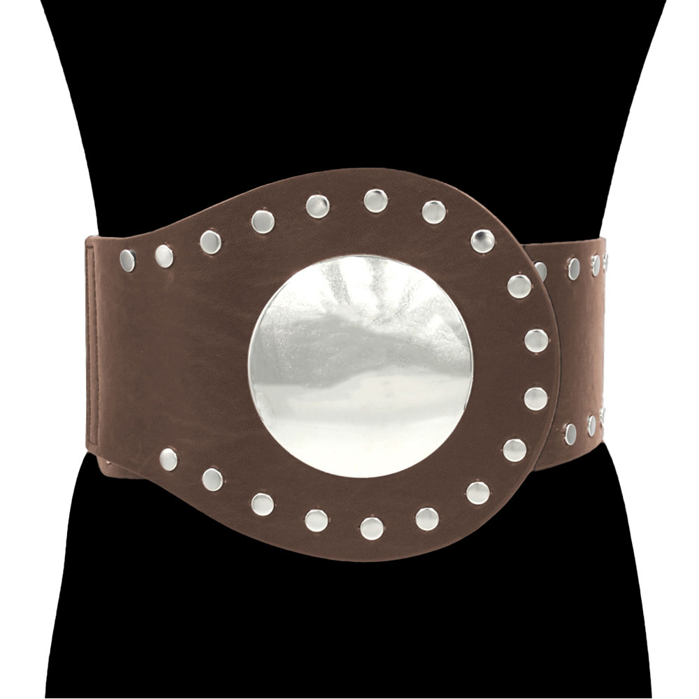 Details • Size : 5" H X 42" L (appx) • Adjustable 34" L - 38" L • This studded wide statement waist belt features a bold circular buckle with metallic accents that command attention. Designed to accentuate the waist with a contemporary edge, it adds a confident, high-fashion finish to dresses or tunics. Perfect for a chic and standout look. • Lead and Nickel Compliant