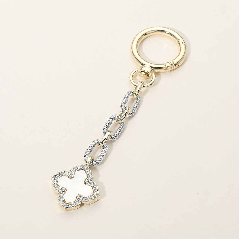 Details • Size : 4.5" L, 1" X 3" • This clover charm keychain features a smooth clover-shaped accent framed with subtle crystal-style detailing and linked chain elements for a refined, elegant look. Designed for easy attachment to keys or bags, it’s ideal for boutiques seeking stylish, giftable accessories that add charm, shine, and everyday functionality. • CZ Cubic Zirconia • Gold Dipped