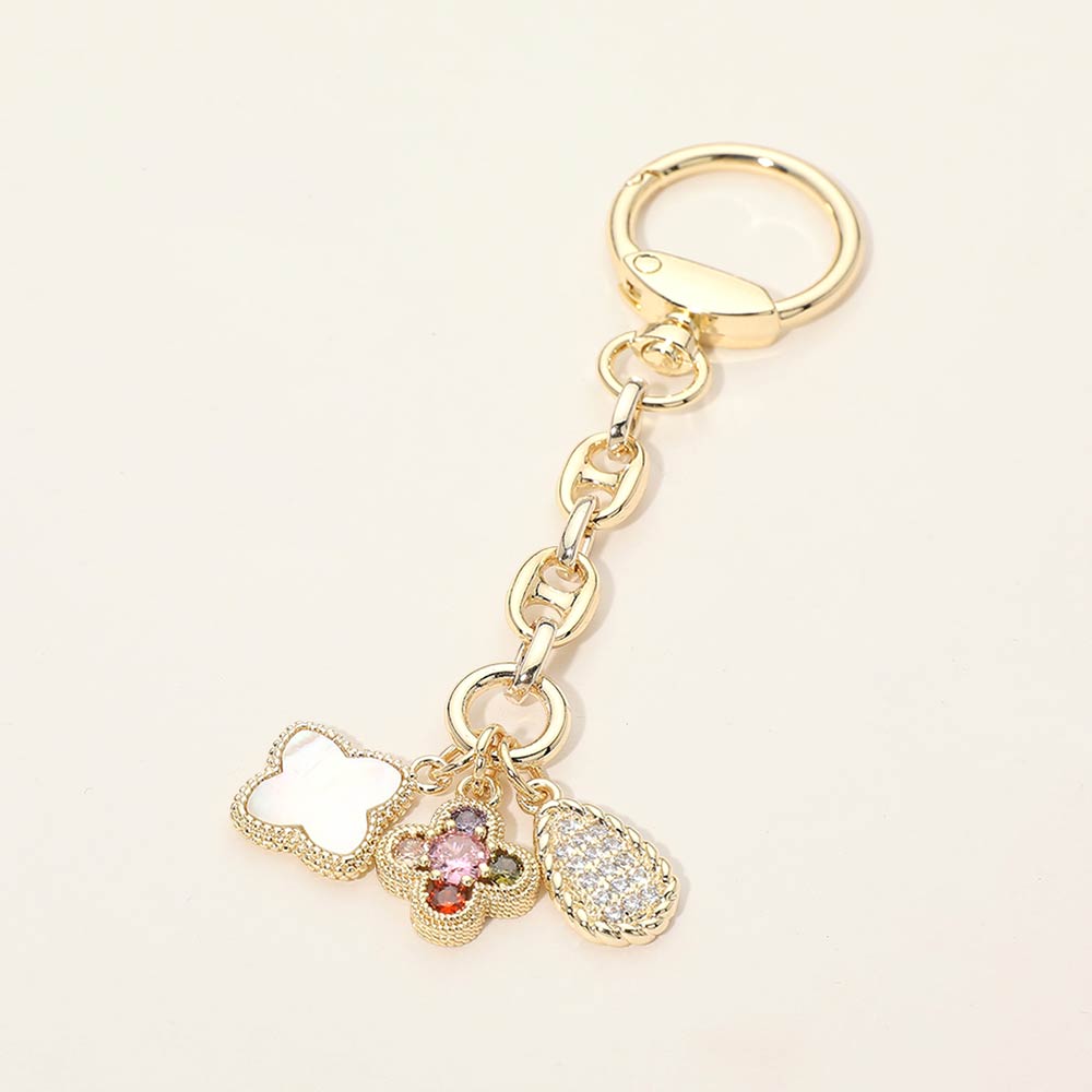 Details • Size : 4.75" L, 1" X 3.2" • This floral charm link chain keychain features layered clover-inspired accents with sparkling detail for a refined yet playful look. Designed to elevate keys, handbags, or bag charms, it adds decorative appeal and everyday functionality. A perfect choice for gifting, boutique assortments, or curated accessory collections, offering versatile styling and eye-catching charm in one elegant piece. • CZ Cubic Zirconia • Gold Dipped