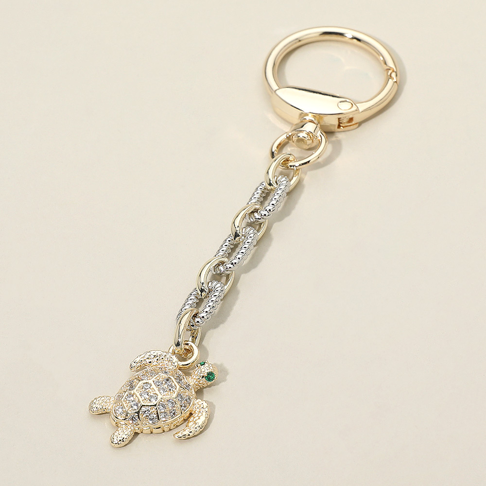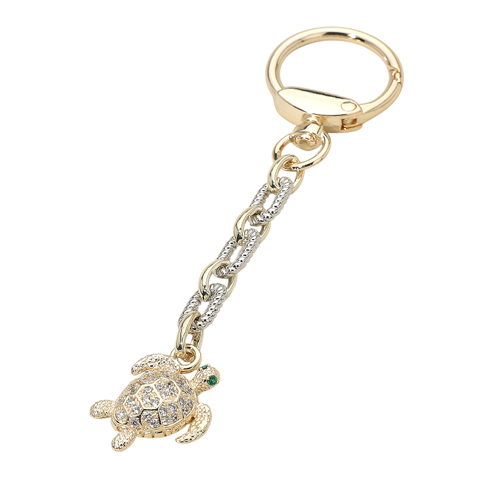 Details • Size : 4.8" L, 0.8" X 1.1" • Add playful personality to your everyday essentials with this turtle charm chain keychain featuring a detailed crystal-accented pendant and bold link chain design. Perfect for keys or bags, it adds stylish flair while offering a unique accessory ideal for gifting or personal use. • CZ Cubic Zirconia • Gold Dipped