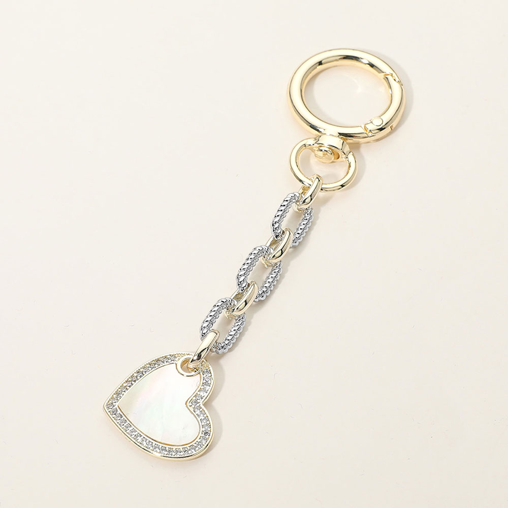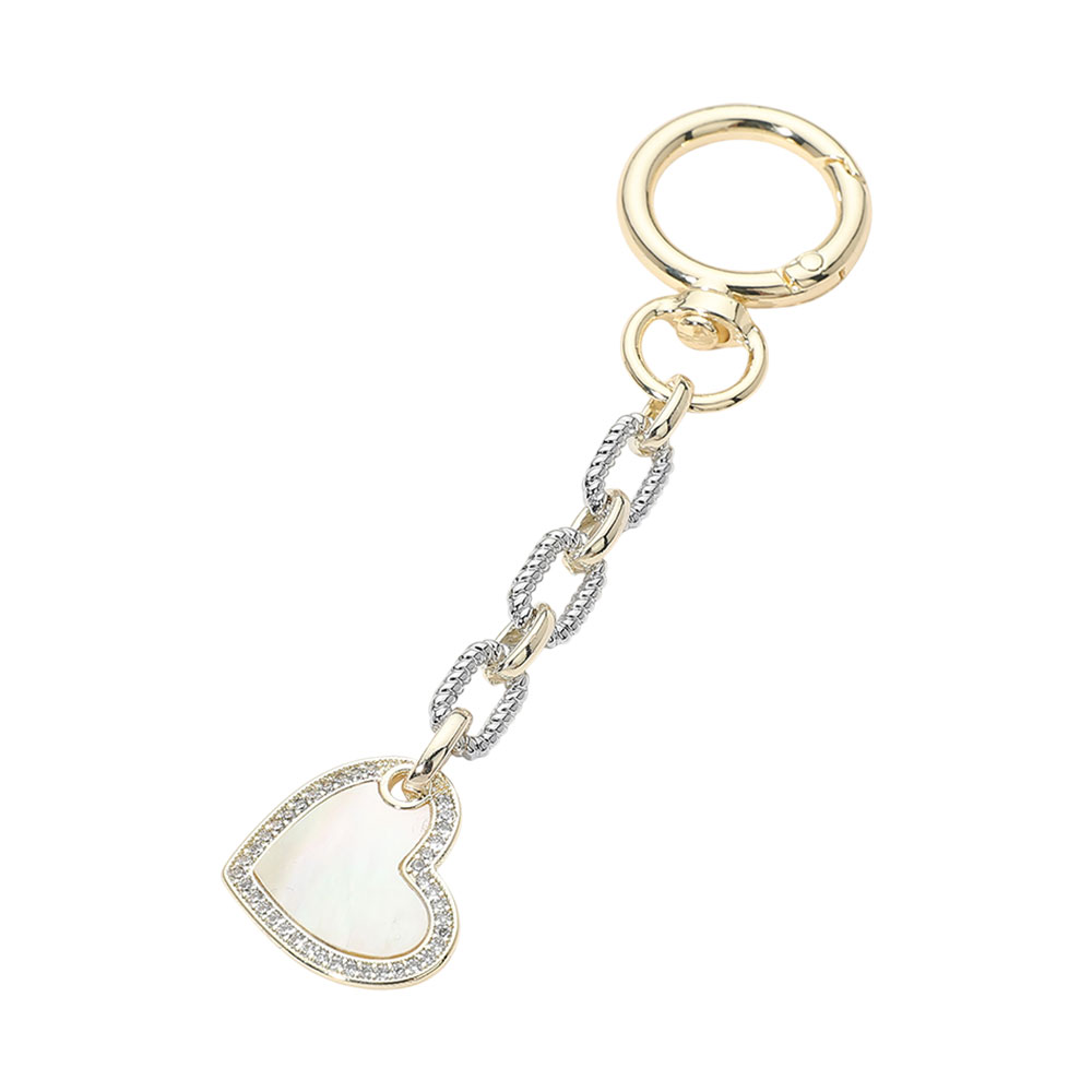 Details • Size : 4.5" L, 1" X 3" • This heart charm keychain features a smooth heart-shaped accent framed with subtle crystal-style detailing and linked chain elements for a refined look. Designed for easy attachment to keys or bags, it’s ideal for boutiques seeking elegant, giftable accessories that add charm, shine, and everyday functionality. • CZ Cubic Zirconia • Gold Dipped