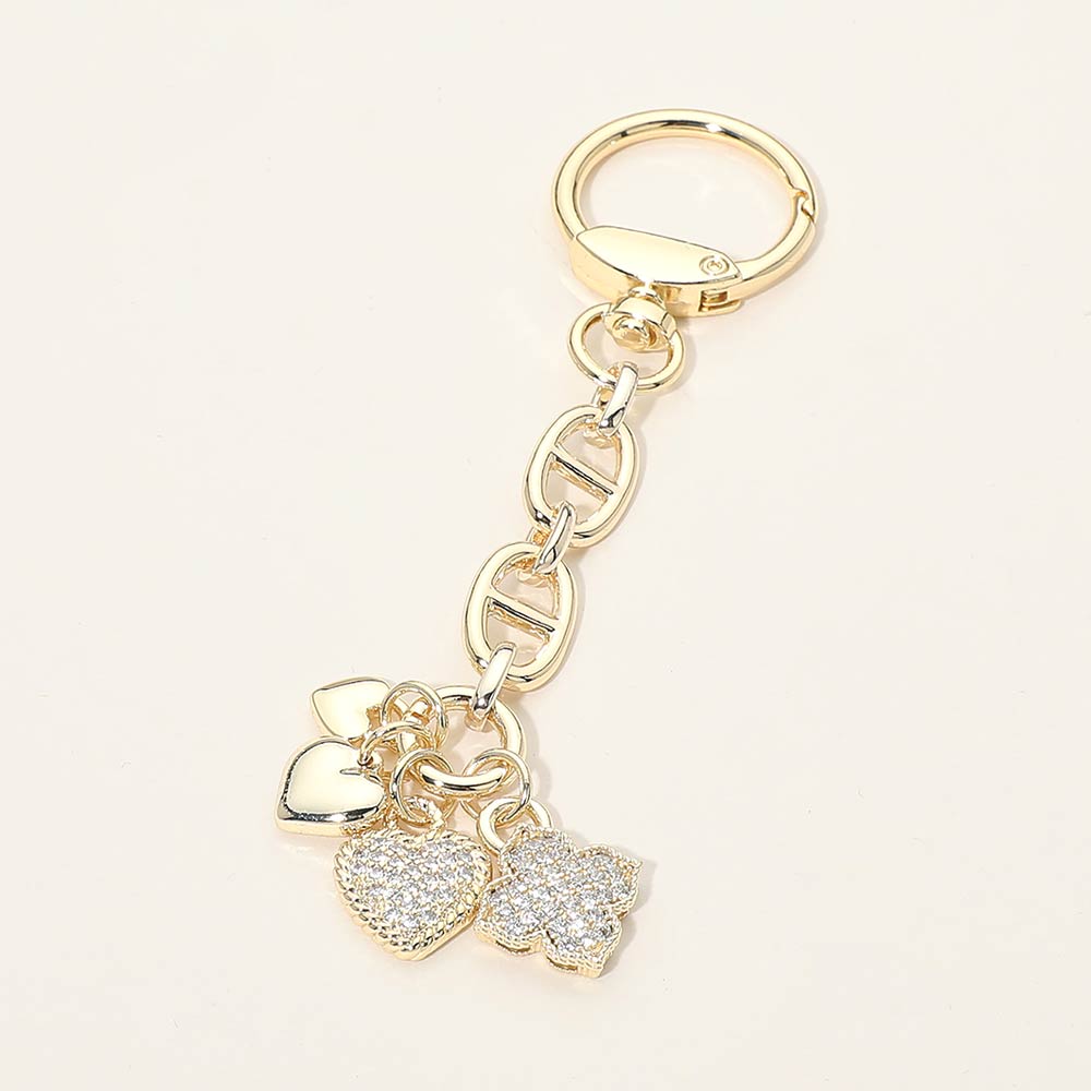 Details • Size : 4.8" L, 1" X 3.25" • This elegant charm chain keychain features layered heart accents with sparkling detail and a modern link design, creating a stylish and eye-catching accessory. Perfect for keys, handbags, or bag charms, it adds romantic appeal and everyday versatility. An ideal option for gifting, boutique displays, or curated accessory collections, offering a polished look with timeless charm. • Gold Dipped • CZ Cubic Zirconia