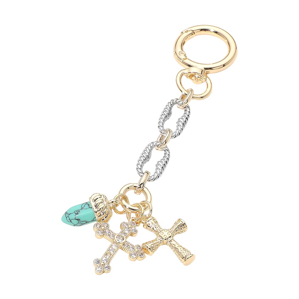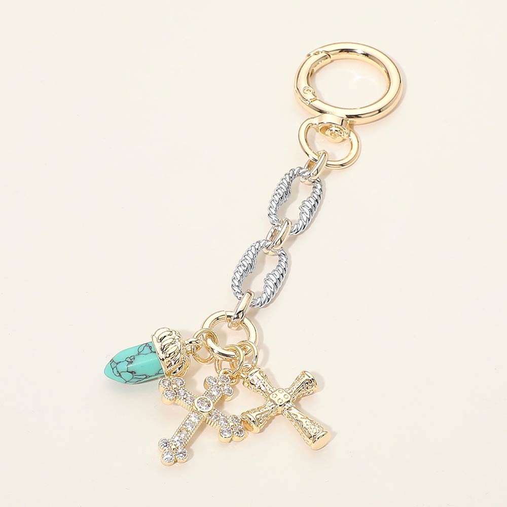 Details • Size : 5.25" L, 1" X 3.5" • This statement charm chain keychain showcases layered cross accents with sparkling detail and a decorative drop element, creating a bold yet refined accessory. Designed to elevate keys, handbags, or bag charms, it offers symbolic style with everyday versatility. A great choice for gifting, boutique displays, or curated accessory collections, blending meaningful design with polished fashion appeal. • CZ Cubic Zirconia • Gold Dipped