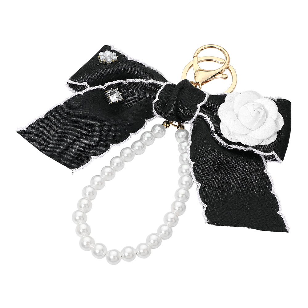 Flower Rhinestone Accent Pearl Loop Bow Keychain Bag Charm