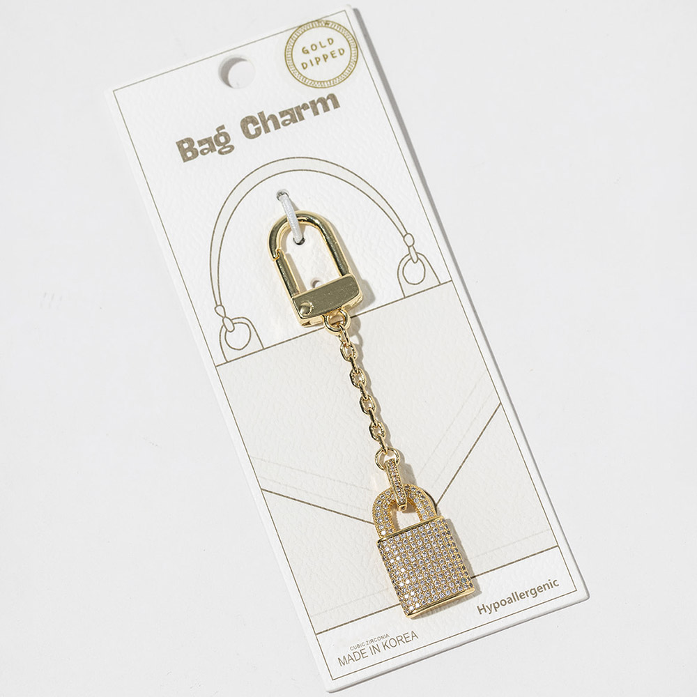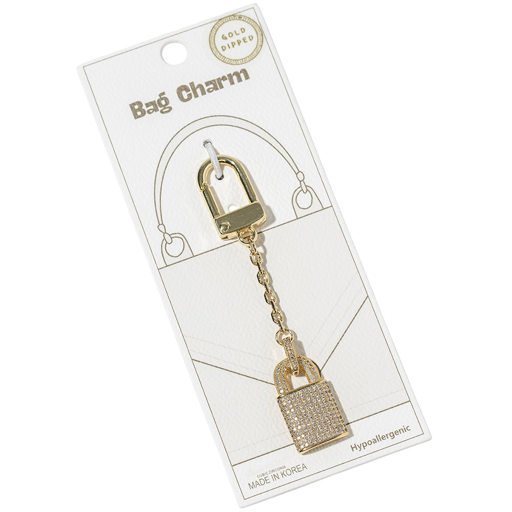 Details • Size : 3.4" L, 0.6" X 2.5" • Stylish padlock bag charm designed with sparkling crystal accents for a bold, modern statement. Clips easily onto handbags, totes, backpacks, or keys to add shine and personality. A chic accessory perfect for gifting, trend-driven displays, and boutique collections seeking eye-catching detail. • CZ Cubic Zirconia • Gold Dipped • Hypoallergenic • Lead and Nickel Compliant • Made In Korea