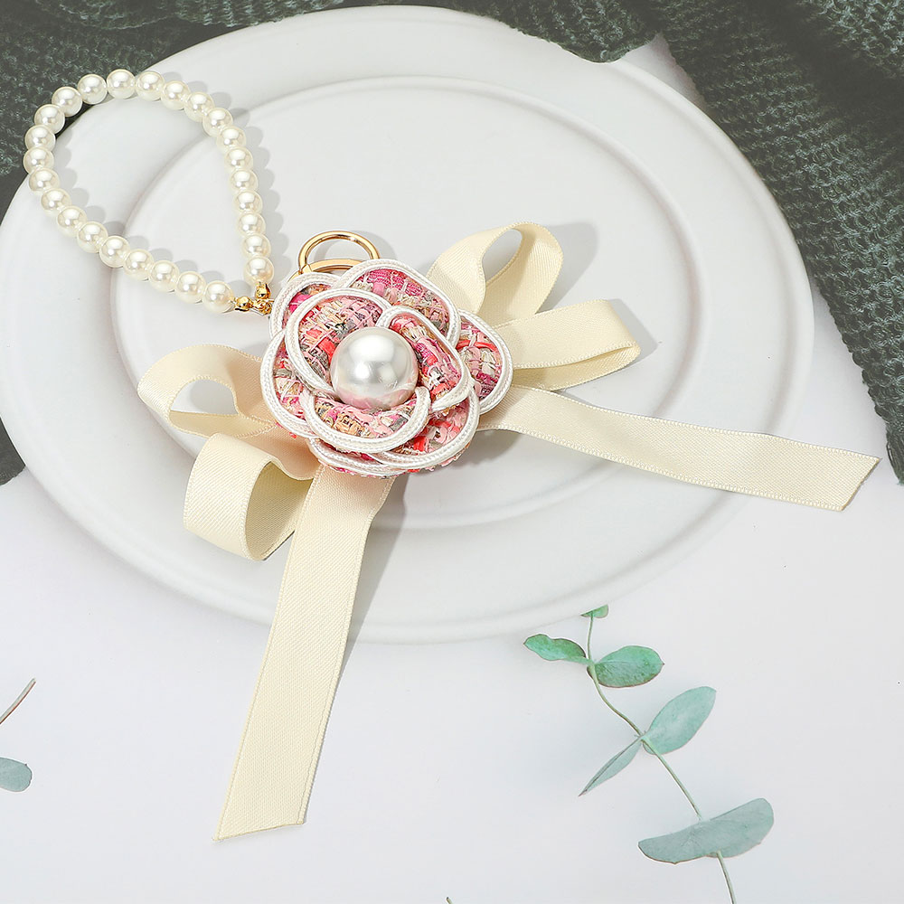 • Elegant keychain featuring a satin bow and layered floral centerpiece with a pearl detail, attached to a beaded loop. A stylish accessory perfect for adding elegance to your keys or bag.