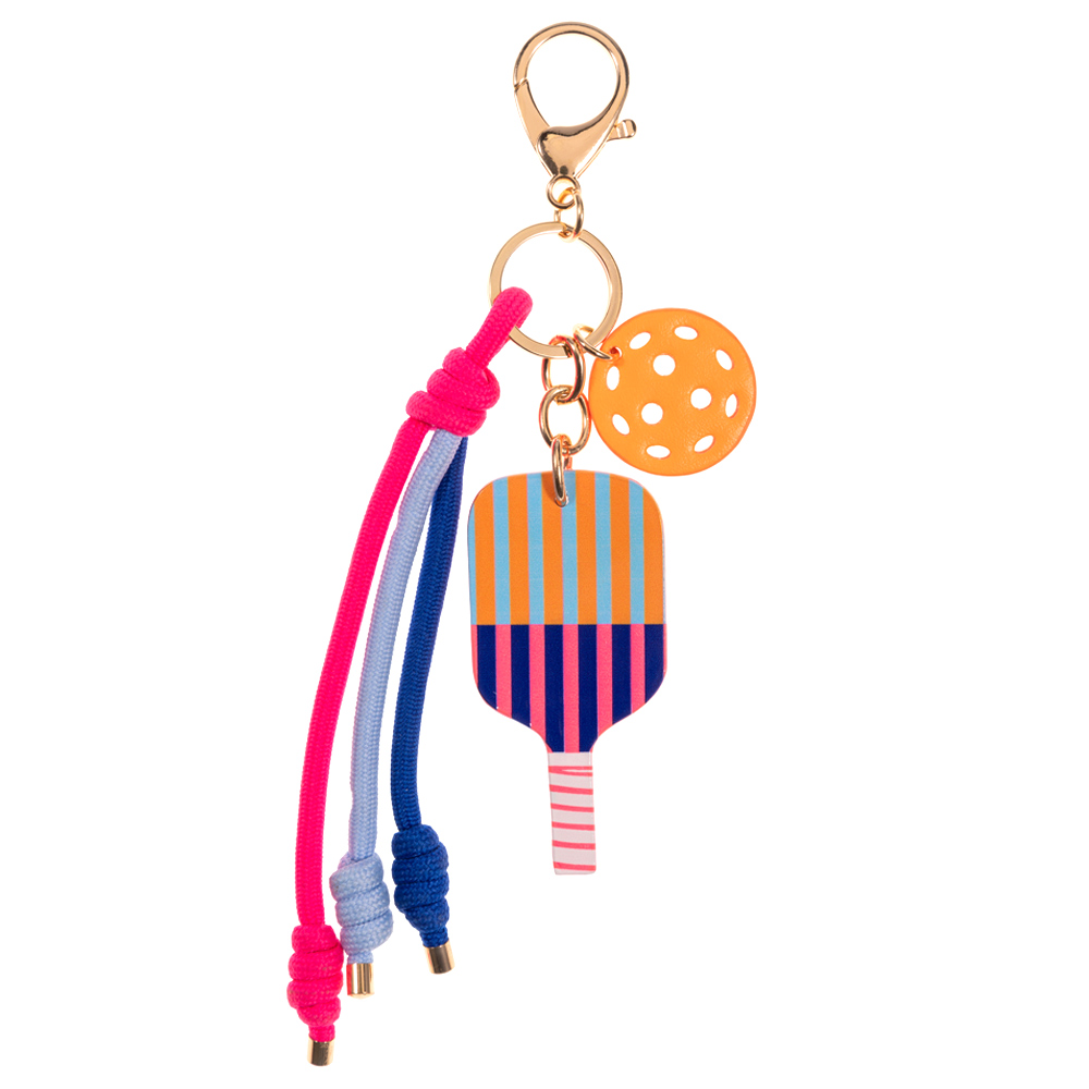 • This pickleball-themed keychain features a playful paddle charm paired with a perforated ball accent and knotted cord tassels for added texture and movement. Designed with a secure clasp for easy attachment, it’s a fun accessory for keys, bags, or backpacks and makes a great gift for pickleball fans, team events, and sporty lifestyle collections.