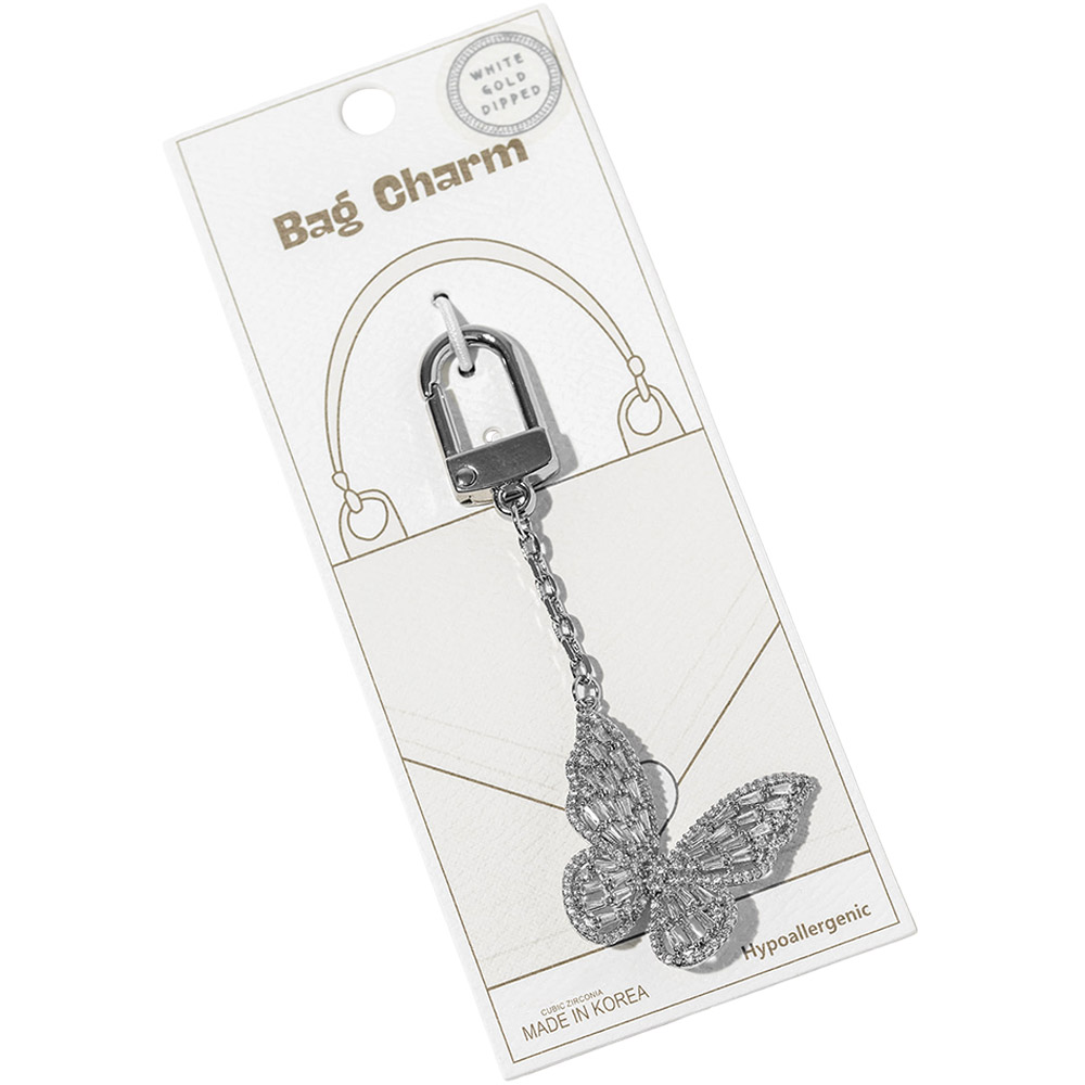 Details • Size : 3.5" L, 1.4" X 2.5" • Elegant butterfly bag charm designed with shimmering crystal accents for a graceful, eye-catching statement. Clips easily onto handbags, totes, backpacks, or keys to add movement and shine. A stylish accessory perfect for gifting, seasonal collections, and boutique displays seeking feminine charm. • Lead and Nickel Compliant • Hypoallergenic • Made In Korea • Gold Dipped • CZ Cubic Zirconia