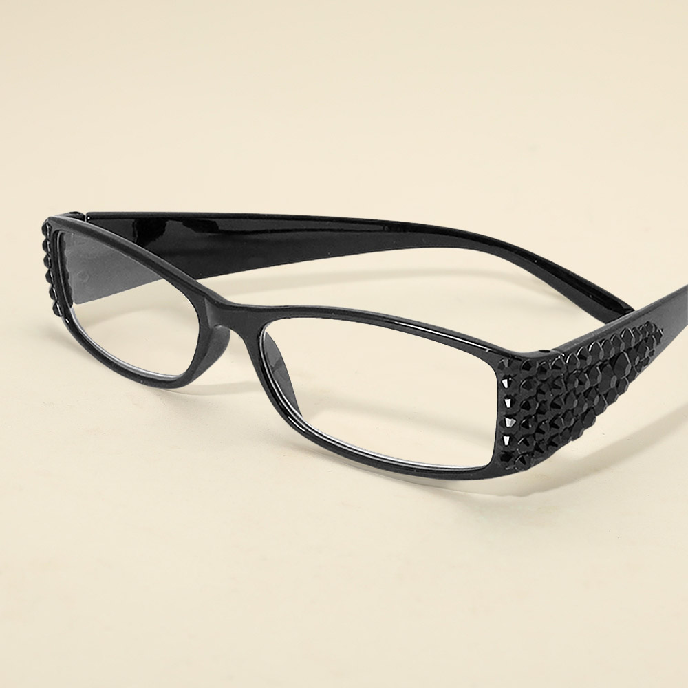 • Stylish reading glasses designed with sparkling embellishments along the frames. Offering both function and flair, they bring a touch of glamour to everyday eyewear while ensuring comfort and clarity for daily use.