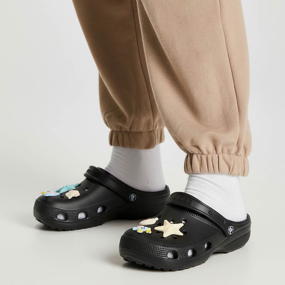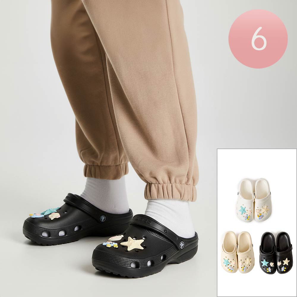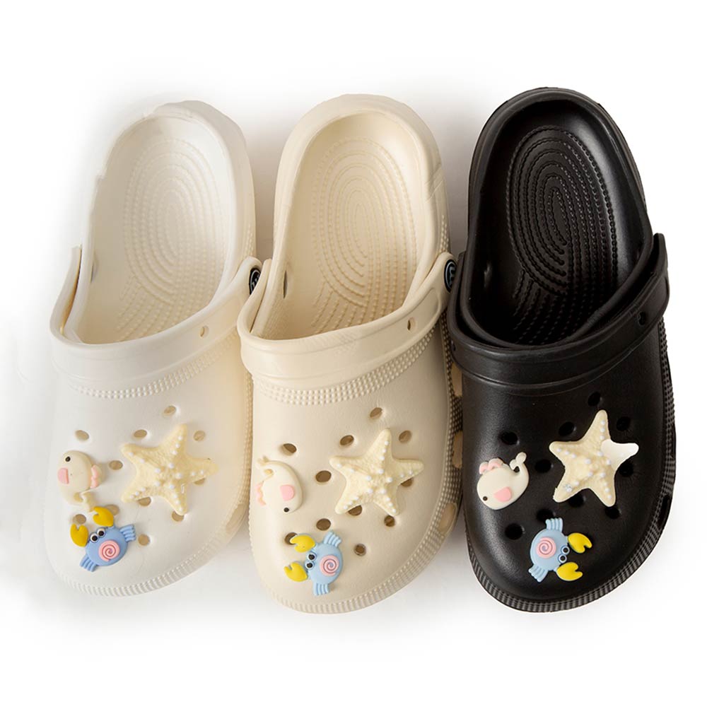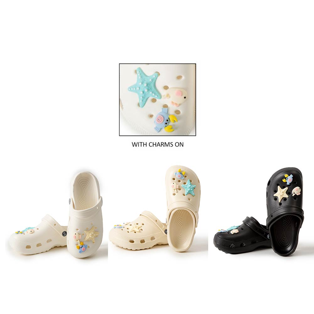 Details • Size : 6 Pairs Assorted size in each pack • Small, 2 Medium, 2 Large • S Size : US 6 ~ 7 (36-37) • M Size : US 8 ~ 9 (38-39) • L Size : US 10 ~ 14 (40-41) • Material : 100% EVA • Playful clog style footwear designed with fun decorative charms, breathable perforations, and a cushioned footbed for everyday comfort. Features a pivot heel strap for secure wear or easy slip-on styling, ideal for casual outings, travel, and relaxed daily looks.