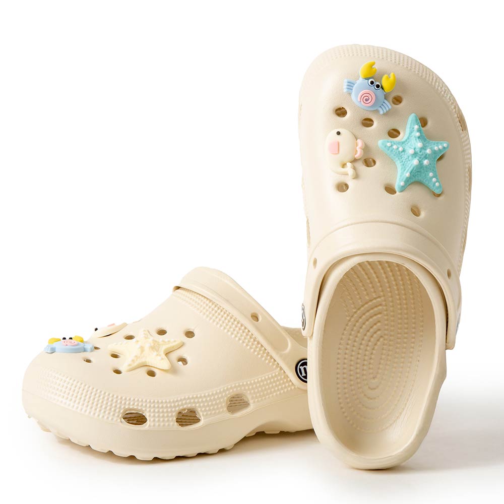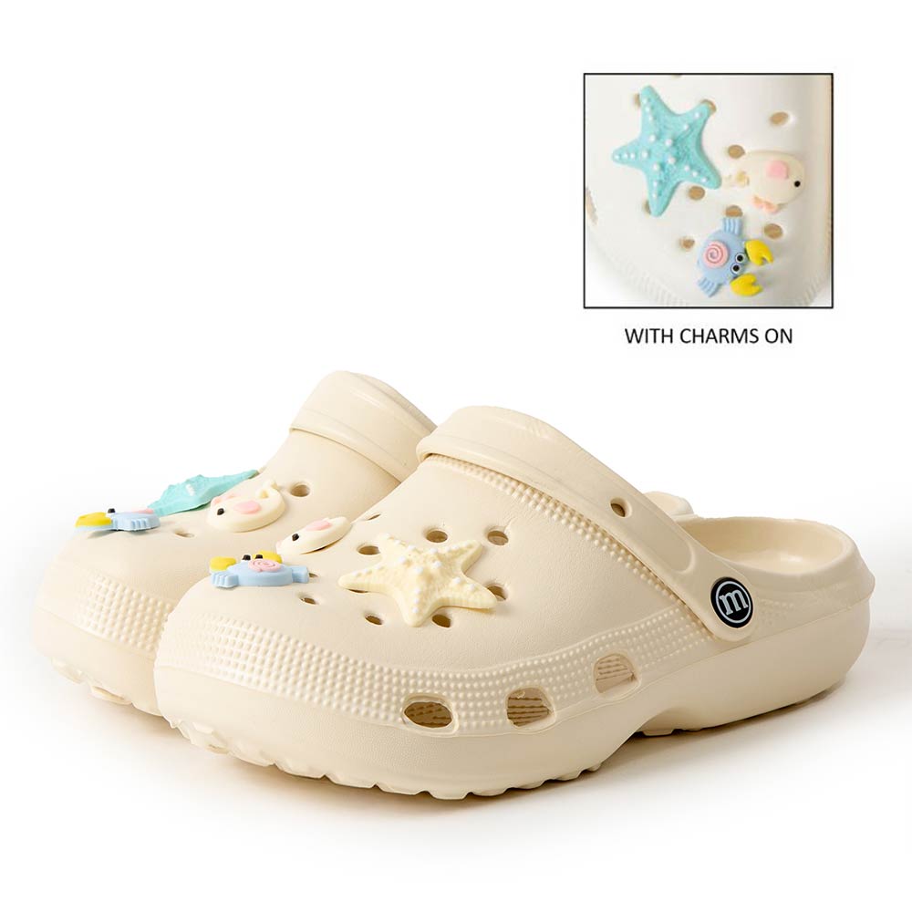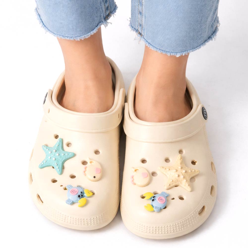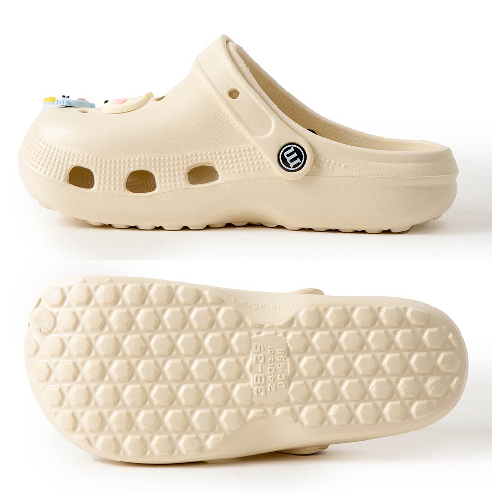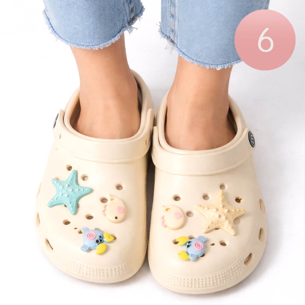 Details • Size : 6 Pairs Assorted size in each pack • Small, 2 Medium, 2 Large • S Size : US 6 ~ 7 (36-37) • M Size : US 8 ~ 9 (38-39) • L Size : US 10 ~ 14 (40-41) • Material : 100% EVA • Playful clog style footwear designed with fun decorative charms, breathable perforations, and a cushioned footbed for everyday comfort. Features a pivot heel strap for secure wear or easy slip-on styling, ideal for casual outings, travel, and relaxed daily looks.