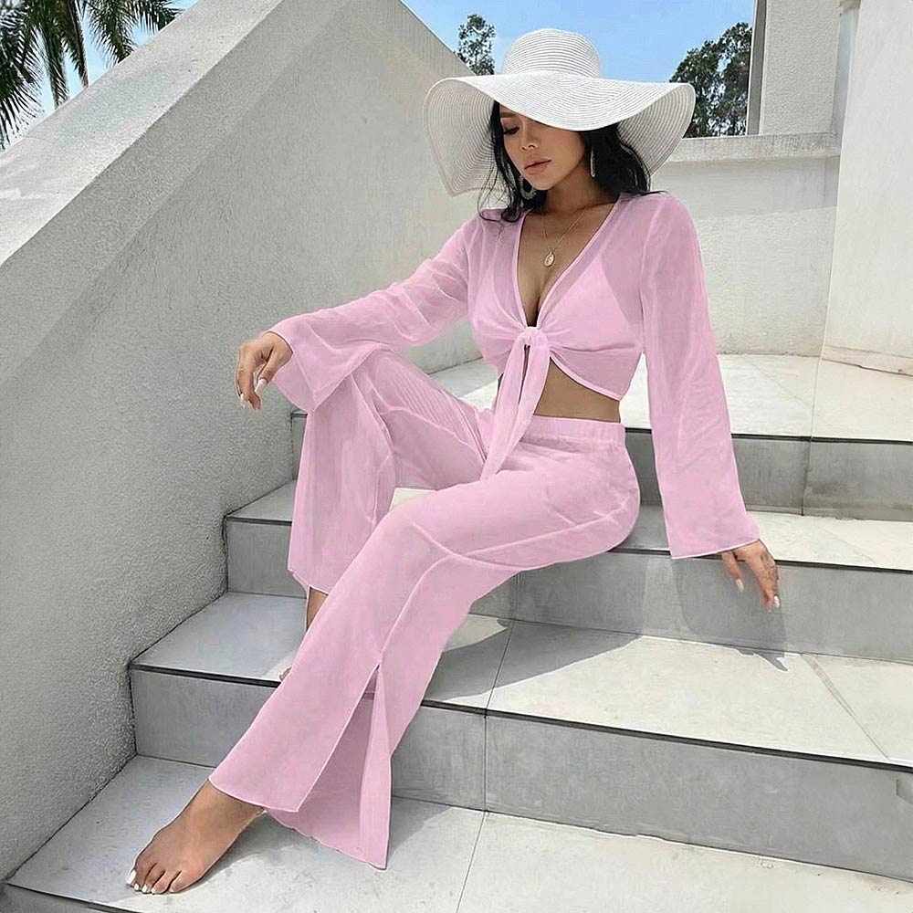 • This two-piece set features a stylish tie-front long sleeve crop top paired with relaxed wide-leg pants for effortless resort styling. Designed for comfort and easy movement, it’s perfect for beach getaways, vacations, or casual outings. Wear together or mix and match for versatile warm-weather looks.