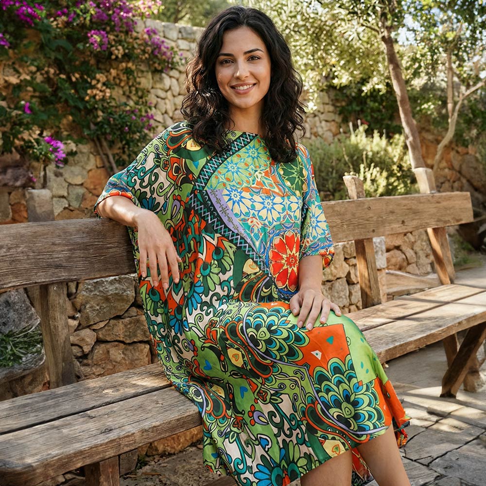 Details • Size : 35" X 36" • Material : 70% Viscose, 30% Silk • This patchwork medallion print kaftan midi dress showcases a relaxed silhouette with an artistic pattern designed for effortless styling. Ideal for resort wear, vacation looks, or boutique collections, it offers comfortable drape, easy wearability, and a flattering fit that transitions seamlessly from daytime outings to casual evening settings.