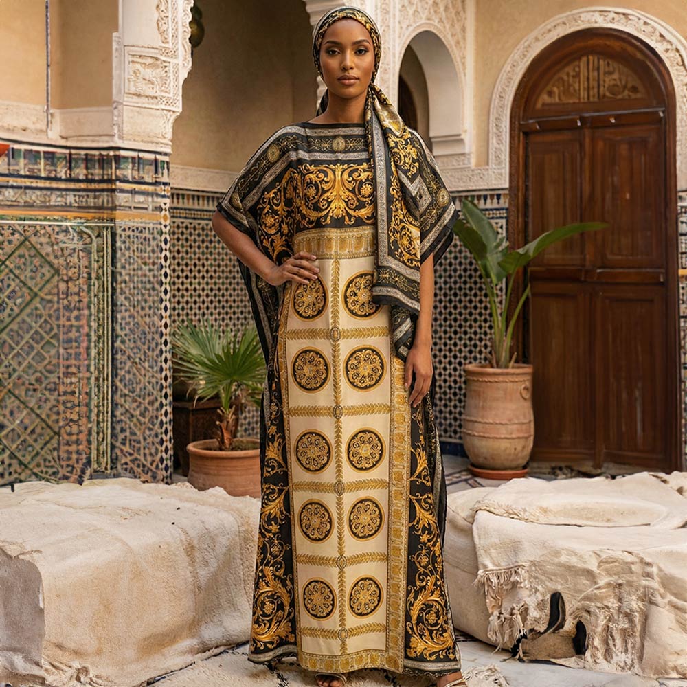 Details • Size : 87" X 140" • Additional Scarf Size: 69" X 19" • Material : 70% Viscose, 30% Silk • This maxi kaftan dress features a flowing silhouette with an elegant allover print and relaxed structure designed for effortless wear. Ideal for resort styling, lounging, or elevated casual looks, it offers comfortable coverage while creating a refined statement suitable for travel, poolside layering, or everyday fashion styling.