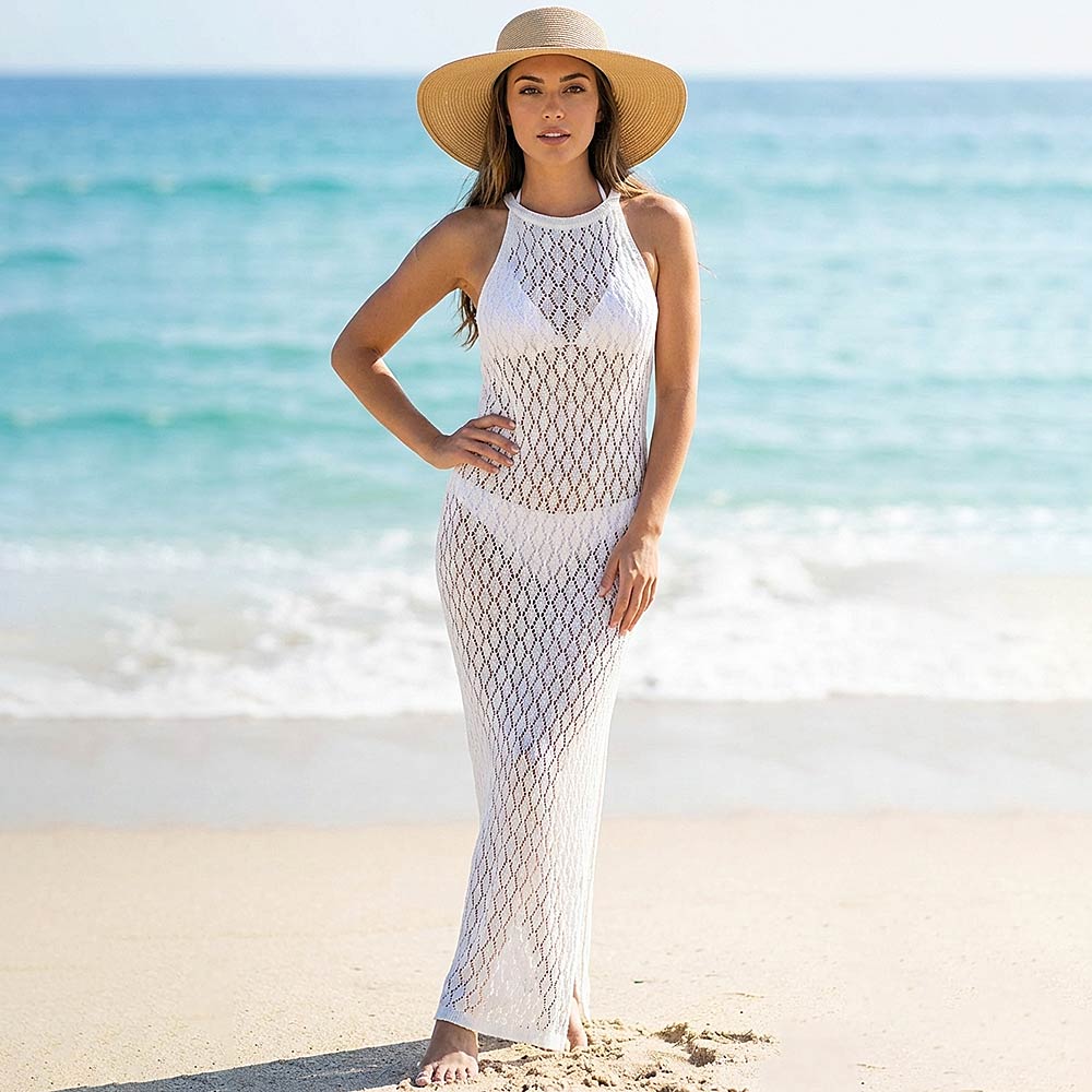 Details • Size : One Size • This halter neck crochet maxi beach cover up dress features an airy open-knit design with a flattering silhouette and side slit for effortless movement. Ideal for layering over swimwear, it’s perfect for beach days, poolside lounging, resort getaways, cruises, and summer boutique collections seeking relaxed yet elevated style.