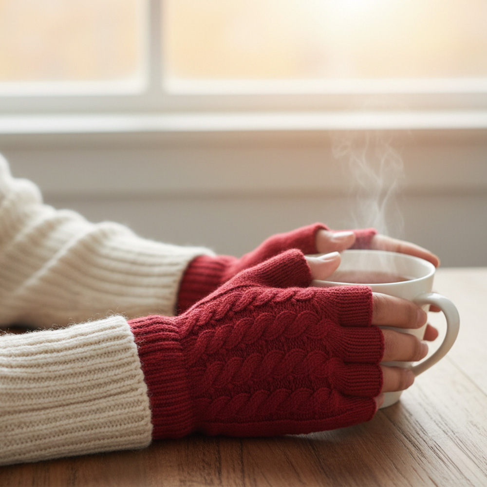 Details • Size : One Size • Material : 80% Acrylic, 20% Nylon • Warm and cozy cable knit fingerless gloves designed with ribbed cuffs for a snug, comfortable fit. Perfect for keeping hands warm while allowing free movement, these stylish gloves are ideal for cold-weather days, adding both texture and charm to any winter outfit.