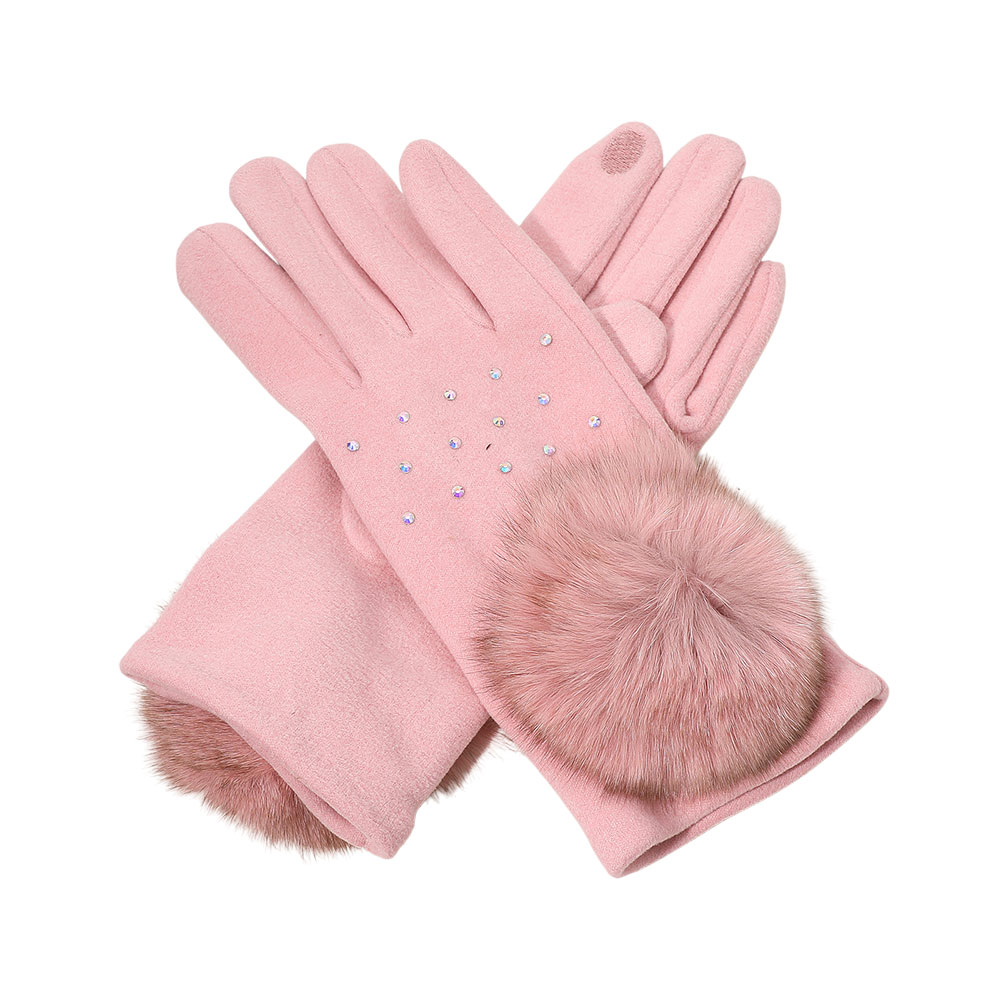 • Elegant smart touch gloves featuring faux fur cuff poms and sparkling rhinestone accents. Designed for warmth and convenience, these chic gloves allow touchscreen use while adding a touch of sophistication to any outfit, perfect for stylish cold-weather wear and everyday elegance.