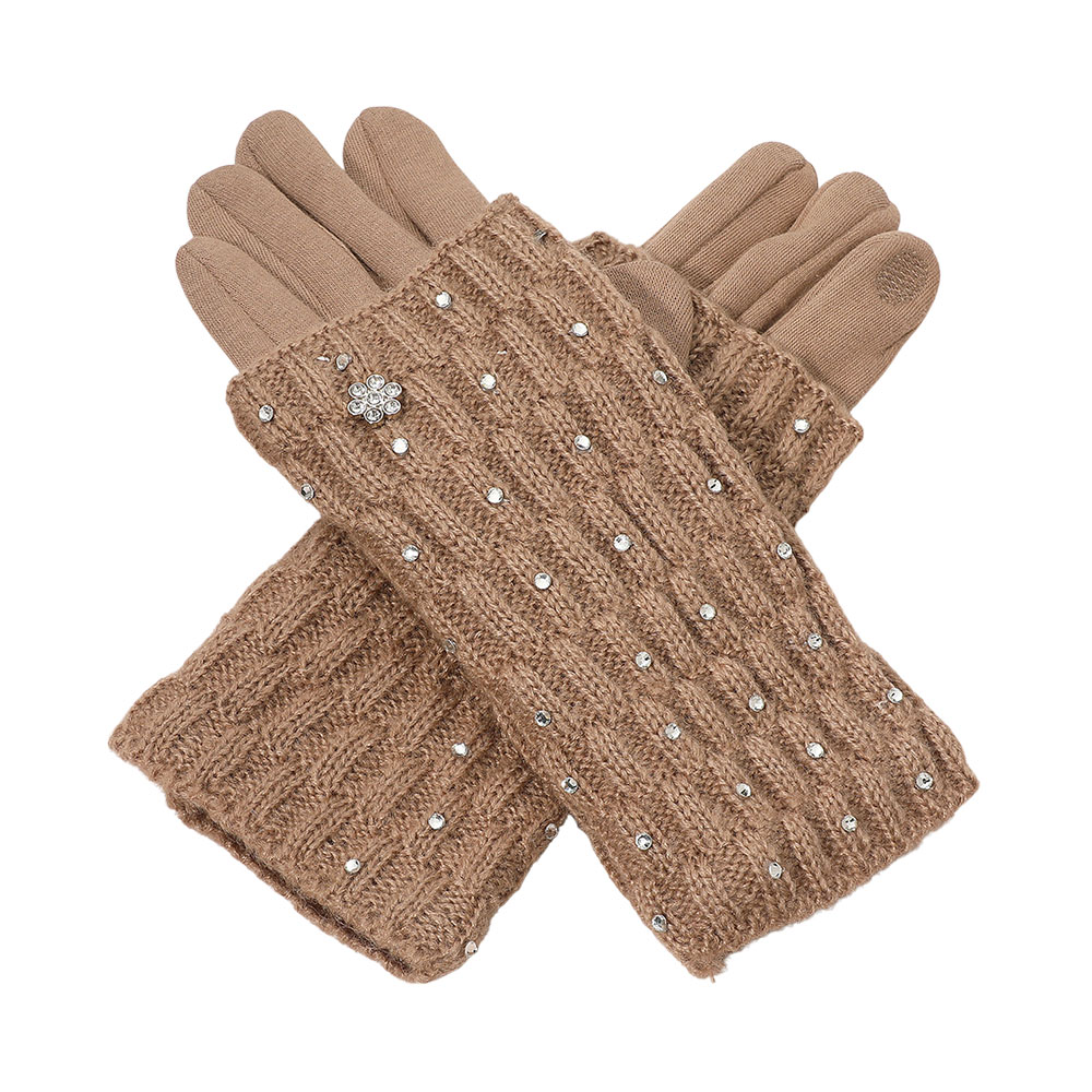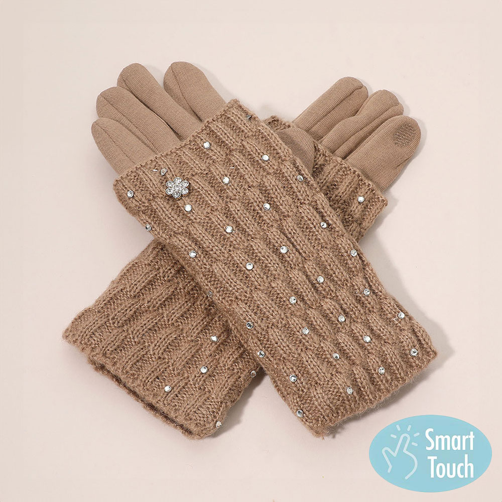 Details • Size : One Size (9.5" L) • Material : 100% Polyester • Smart Touch • Stay stylish and connected with these cozy knit gloves featuring elegant rhinestone accents and Smart Touch fingertips. Designed for comfort and convenience, they keep your hands warm while letting you use your devices effortlessly in cold weather.