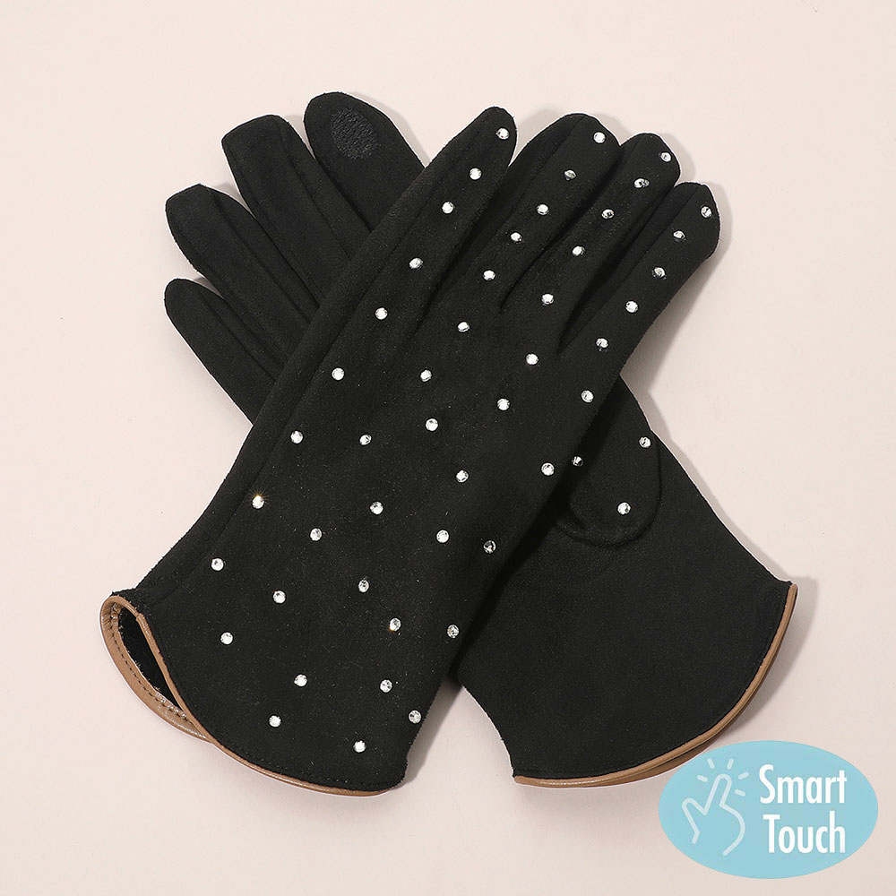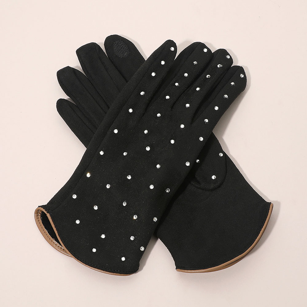 • Elegant smart touch gloves adorned with sparkling rhinestones and a sleek trim finish. These stylish gloves combine comfort with functionality, allowing touchscreen use while keeping hands warm and chic — perfect for both casual outings and sophisticated cold-weather looks.