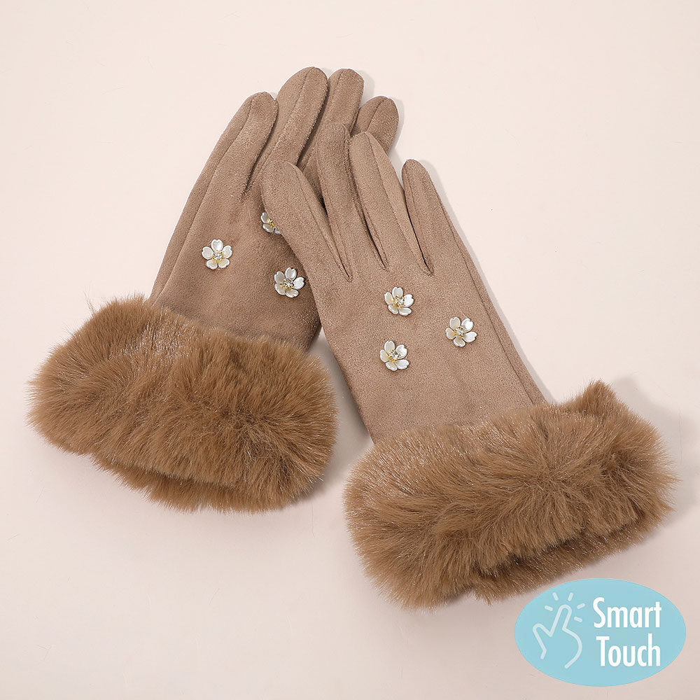 Rhinestone Flower Embellished Faux Fur Cuff Smart Touch Winter Gloves