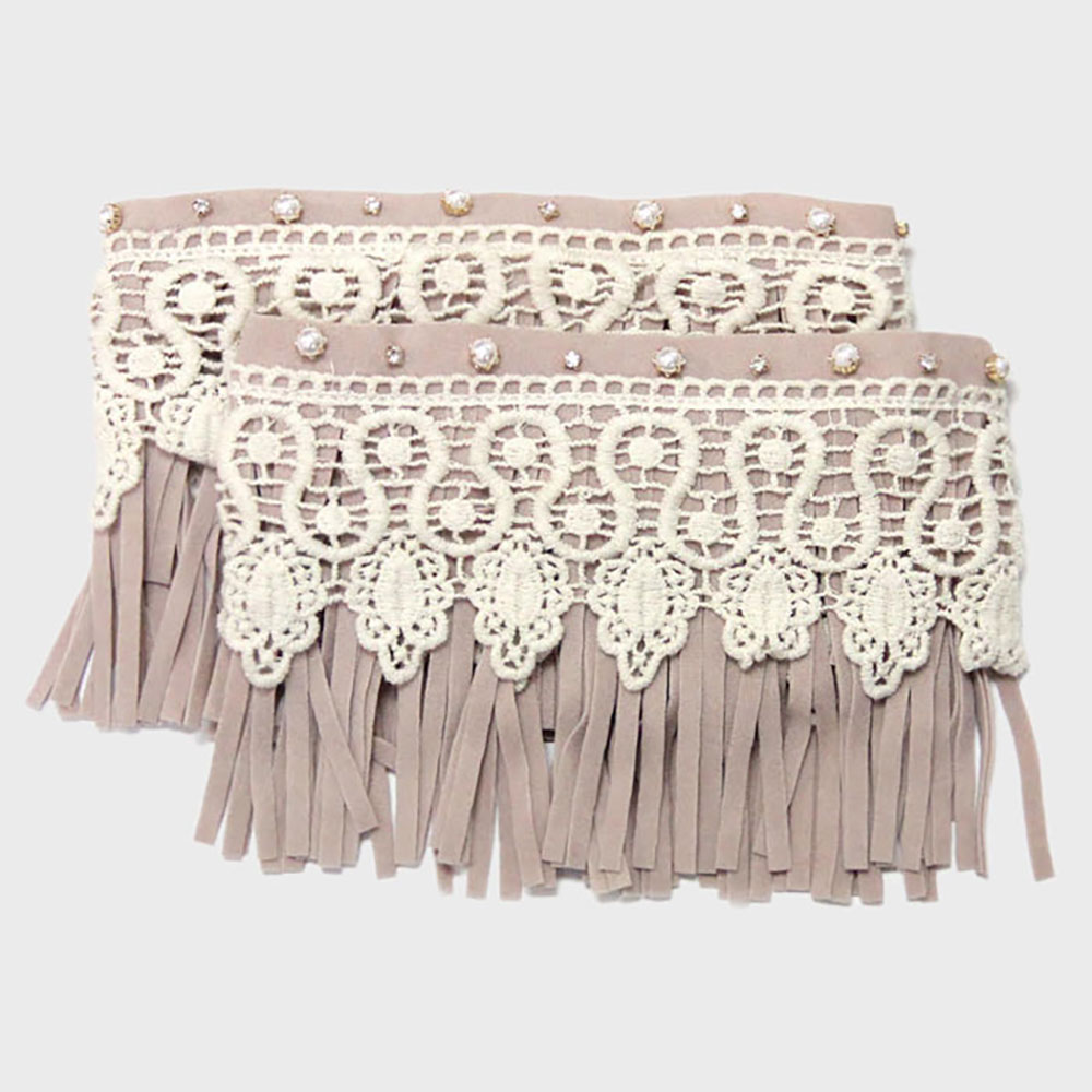 • These lace fringe boot cuff accessories bring a touch of boho-chic flair to any outfit. Featuring elegant lace detail and playful fringe, they slip easily over boots for an instant style upgrade. Perfect for adding texture and feminine charm to both casual and dressy seasonal looks.