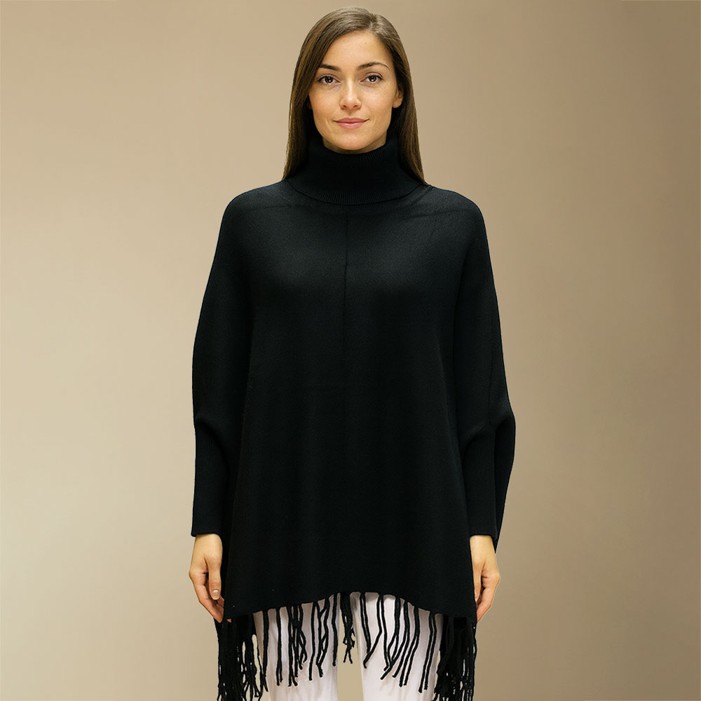 Details • Size : One Size • Material : 100% Acrylic • Stylish turtleneck poncho featuring a relaxed silhouette and flowing fringe hem, designed for easy layering and everyday comfort. Its soft drape and refined details create a chic look perfect for casual outings or polished ensembles.