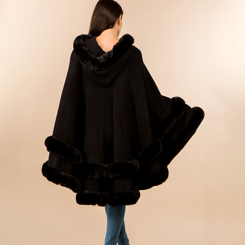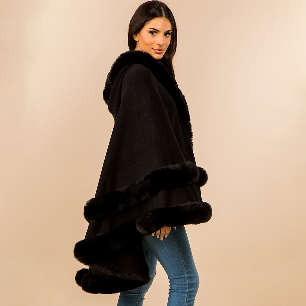 Faux Fur Trim Hooded Elegant Drape Cape Poncho Faux Fur Trim Hooded Elegant Drape Cape Poncho Faux Fur Trim Hooded Elegant Drape Cape Poncho