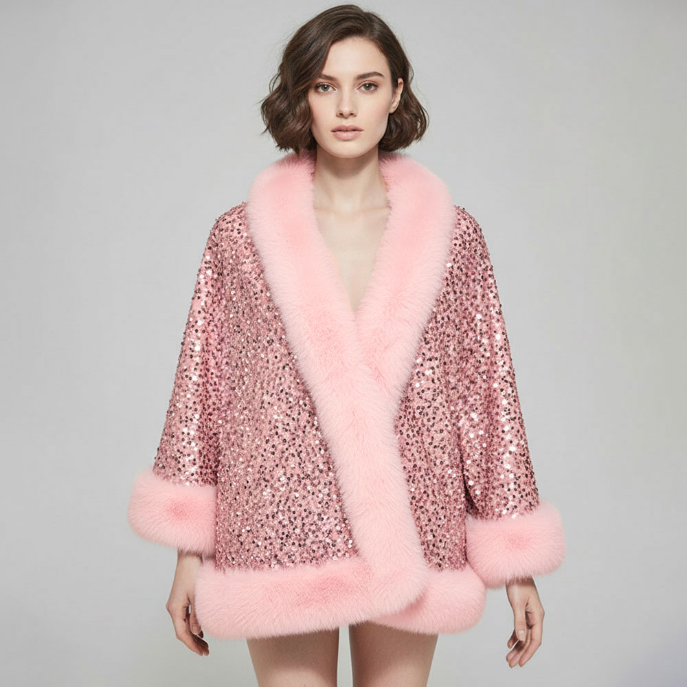 • Chic shawl-style coat featuring a shimmering sequin body and plush trim for an elegant, high-impact look. Perfect for winter events, evening outings, photoshoots or adding glamorous warmth to special occasion outfits with its sophisticated, luxurious silhouette.