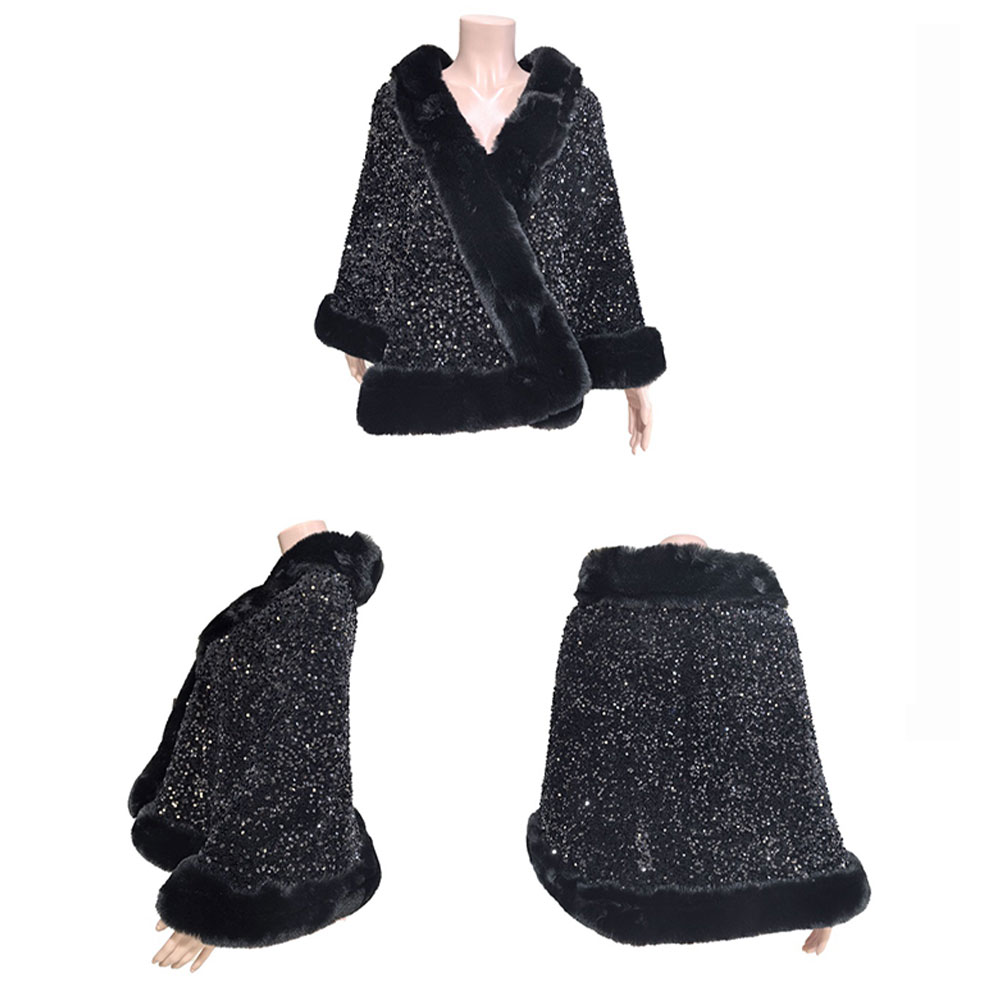 Festive Sequin Faux Fur Trim Shawl Poncho