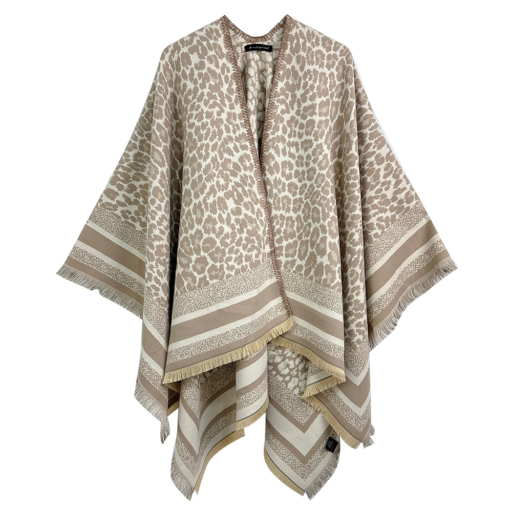• Stay warm and stylish with this poncho featuring a soft leopard-inspired pattern and elegant fringed edges. Perfect for layering over any outfit, it offers a blend of comfort, versatility, and sophistication for both casual days and chic evenings.