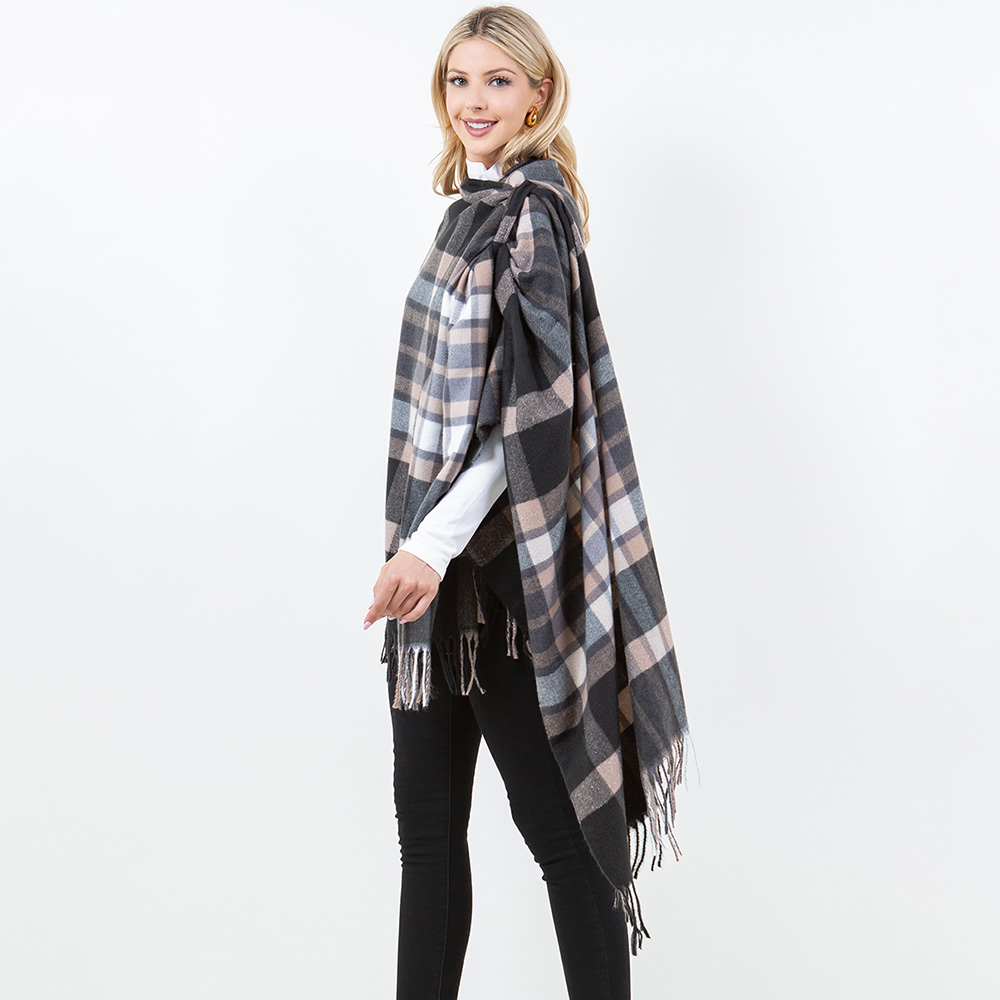 Details • Size : One Size • Material : 100% Acrylic • Wrap yourself in comfort and timeless style with this plaid oversized shawl. Designed with soft fringe detailing, it can be worn as a wrap, poncho, or scarf. Perfect for layering over casual or dressy outfits, it adds warmth and chic flair to any ensemble.