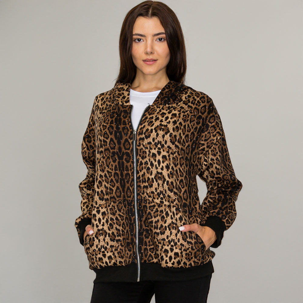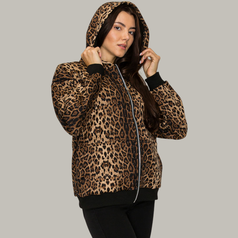 • Stylish Rhinestone Studded leopard print zip-up jacket featuring a relaxed silhouette, hooded detail, front pockets and comfortable everyday wear. A versatile animal print layer perfect for casual looks, easy outfitting and adding standout pattern to any wardrobe.