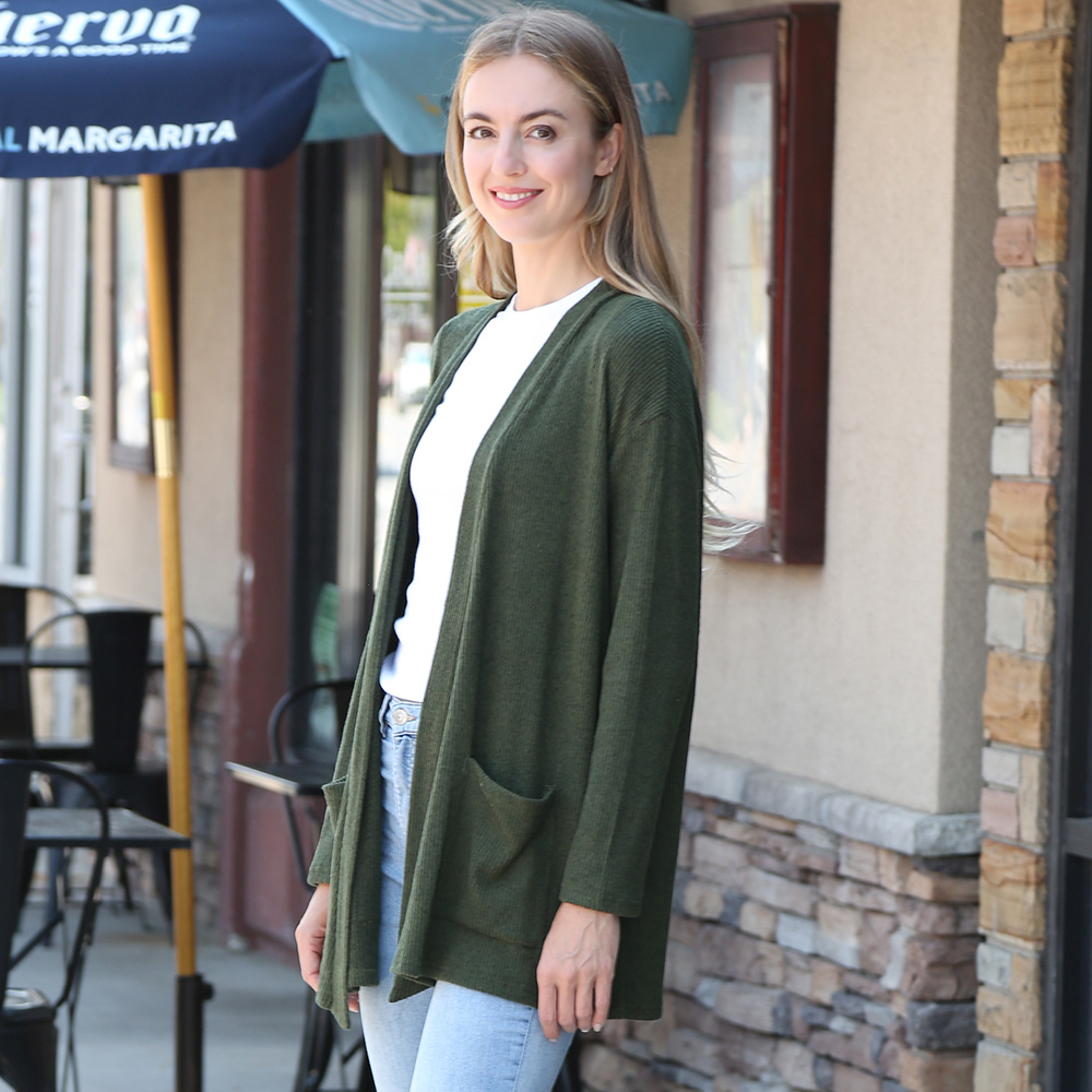 Solid Color Knit Ribbed Open Front Cardigan with Pockets