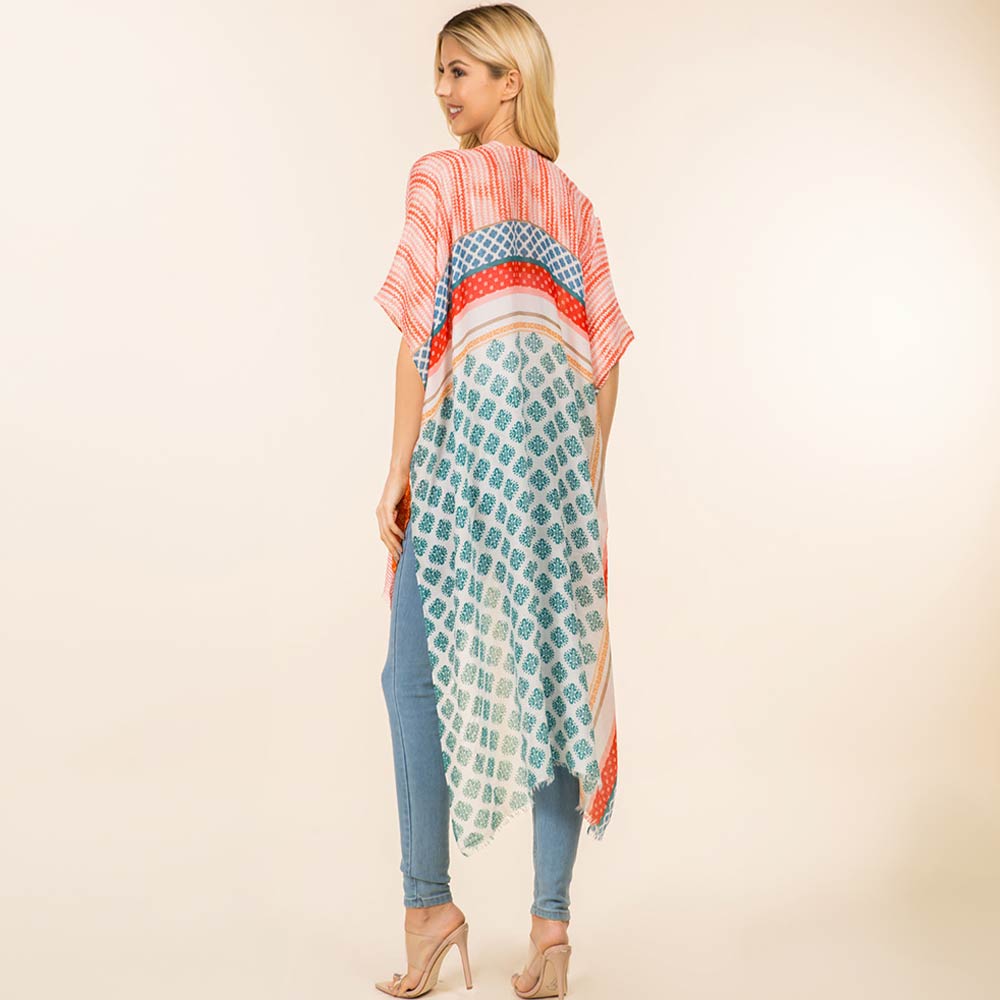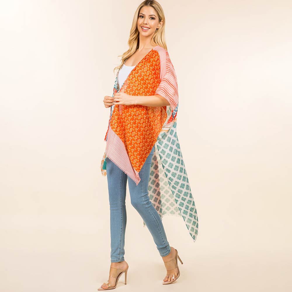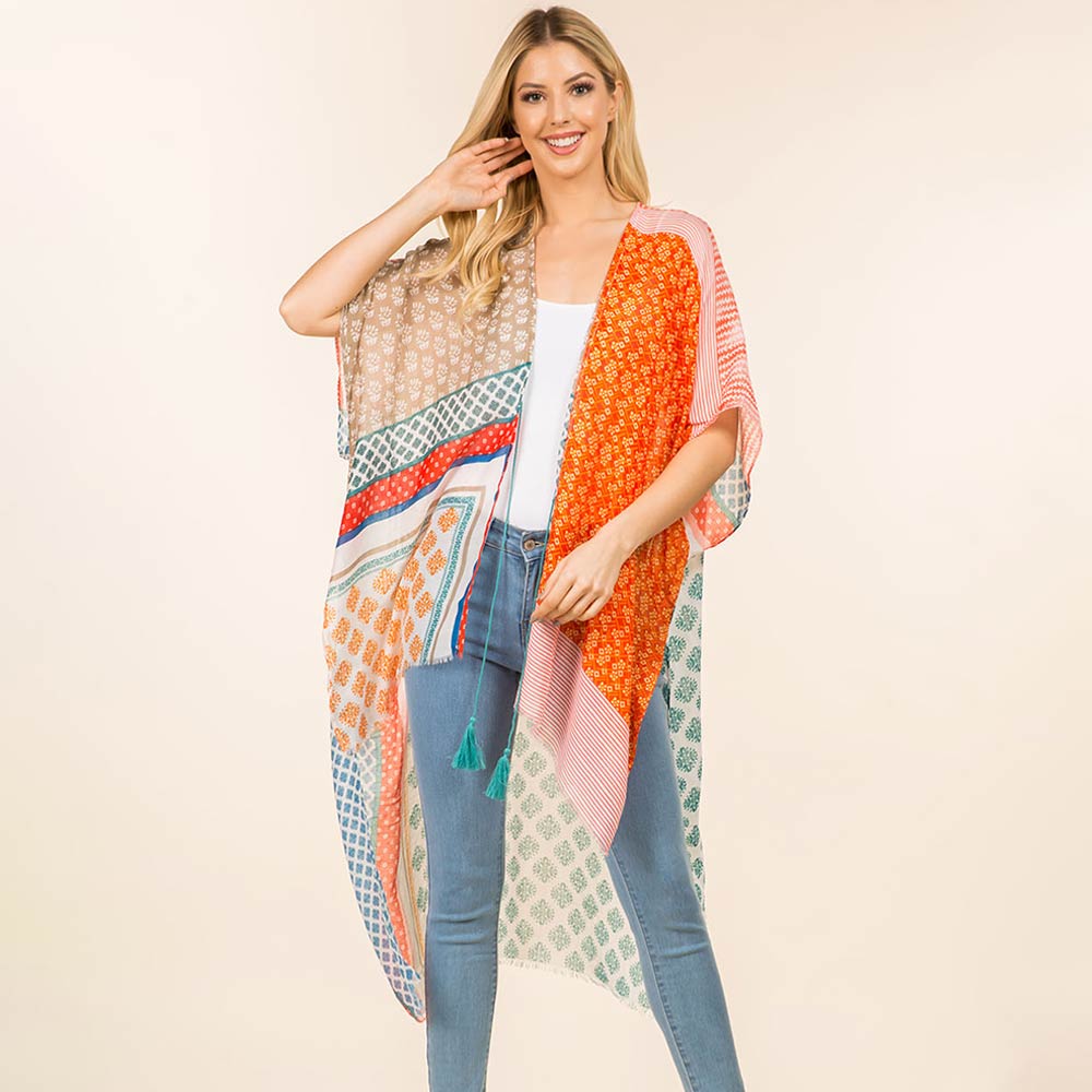 Details • Size : One Size • Material : 100% Polyester • Effortlessly elevate everyday outfits with this patchwork print open front kimono. Designed for versatile layering, it drapes beautifully over casual or dressy looks. A lightweight statement piece perfect for boutiques, seasonal styling, and trend-focused collections.