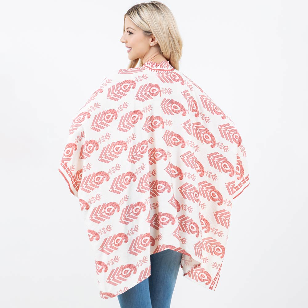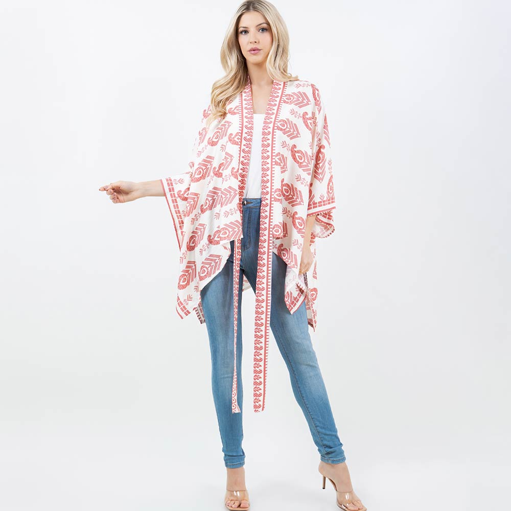 Details • Size : One Size • Material : 100% Polyester • Flowy kimono-style wrap designed with a bold geometric print and a flattering tie-front detail for versatile styling. Drapes effortlessly over tops and casual outfits for everyday wear or travel looks. A stylish layering piece perfect for gifting and boutique collections seeking relaxed, modern appeal.