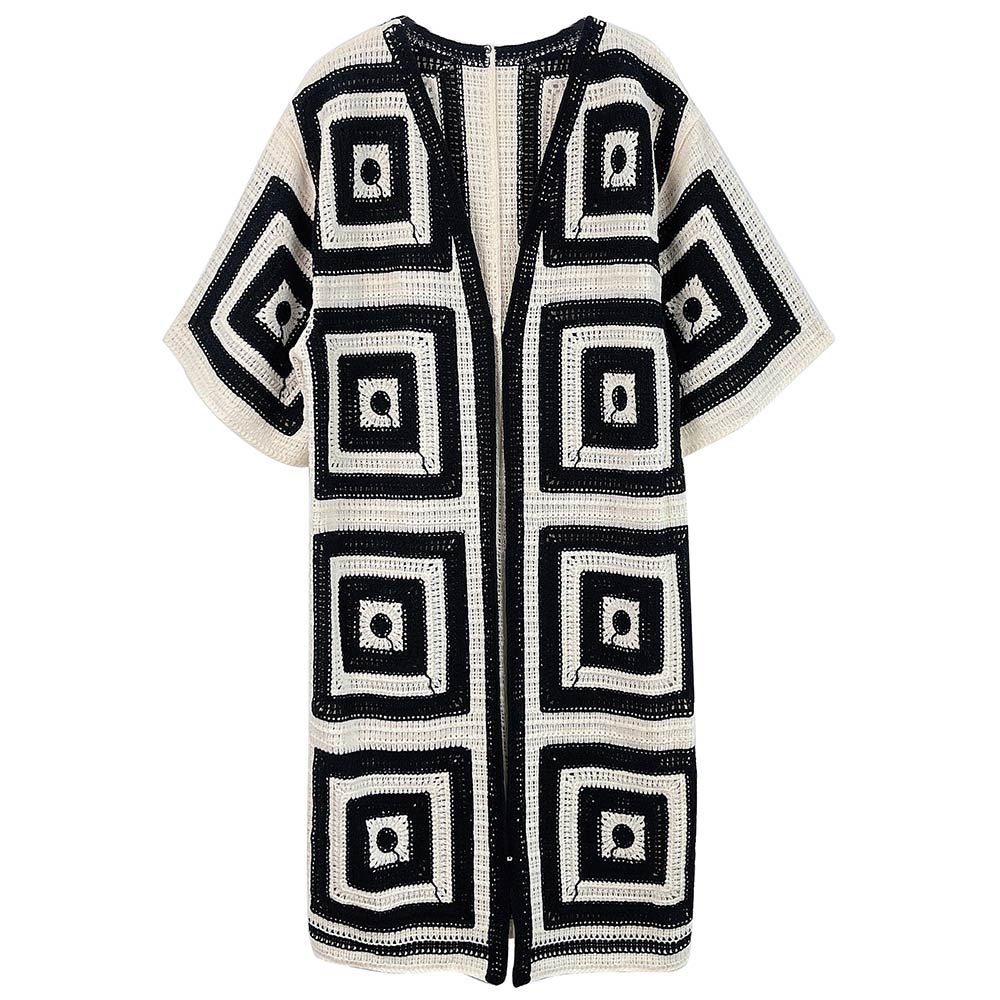 Details • Size : 21" X 40.6" • Material : 100% Acrylic • This granny square crochet long cardigan features an open-front silhouette with bold geometric panels for a statement look. Designed for effortless layering, it adds texture and movement to everyday outfits. Perfect for boutique fashion collections, seasonal transitions, casual styling, and boho-inspired wardrobes.