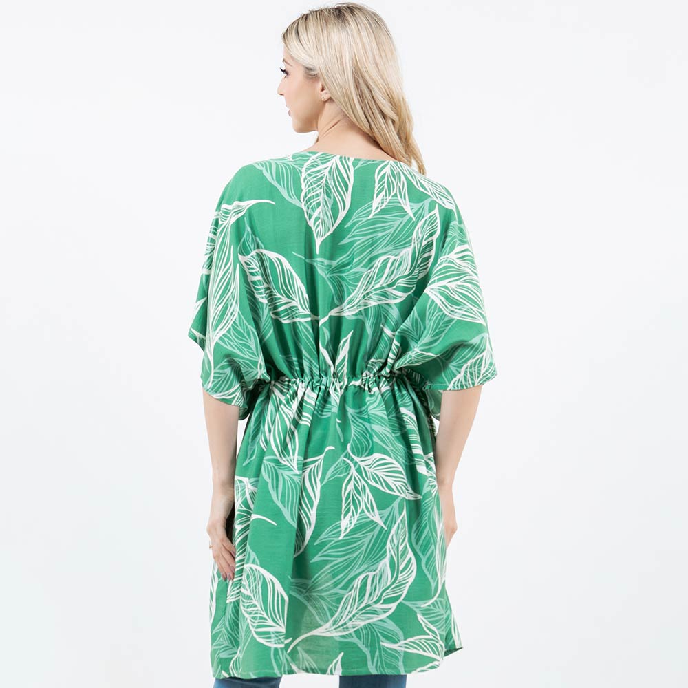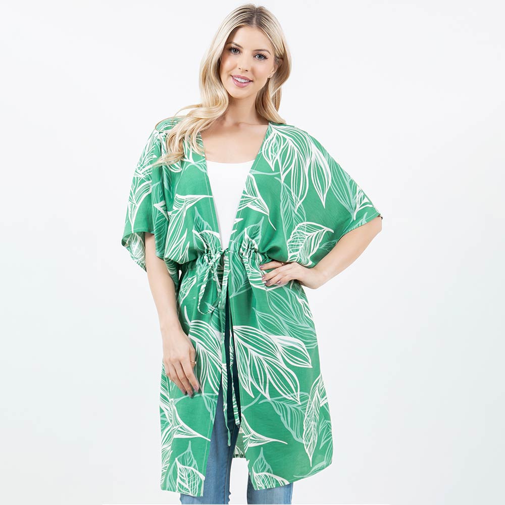 • Flowy kimono-style wrap designed with an allover leaf print and an adjustable drawstring waist for a flattering, relaxed fit. Easy to layer over casual outfits or resort looks for everyday wear or travel. A versatile fashion piece ideal for gifting and boutique collections seeking effortless style.