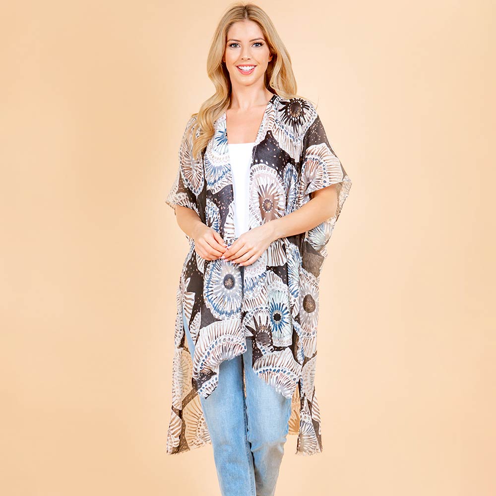 Details • Size : One Size • Material : 100% Polyester • Relaxed open front kimono wrap designed with an eye catching printed pattern and flowy silhouette. Easy to layer over tanks, tees, or dresses, it adds light coverage, movement, and a polished touch to everyday outfits, travel looks, or casual occasions.
