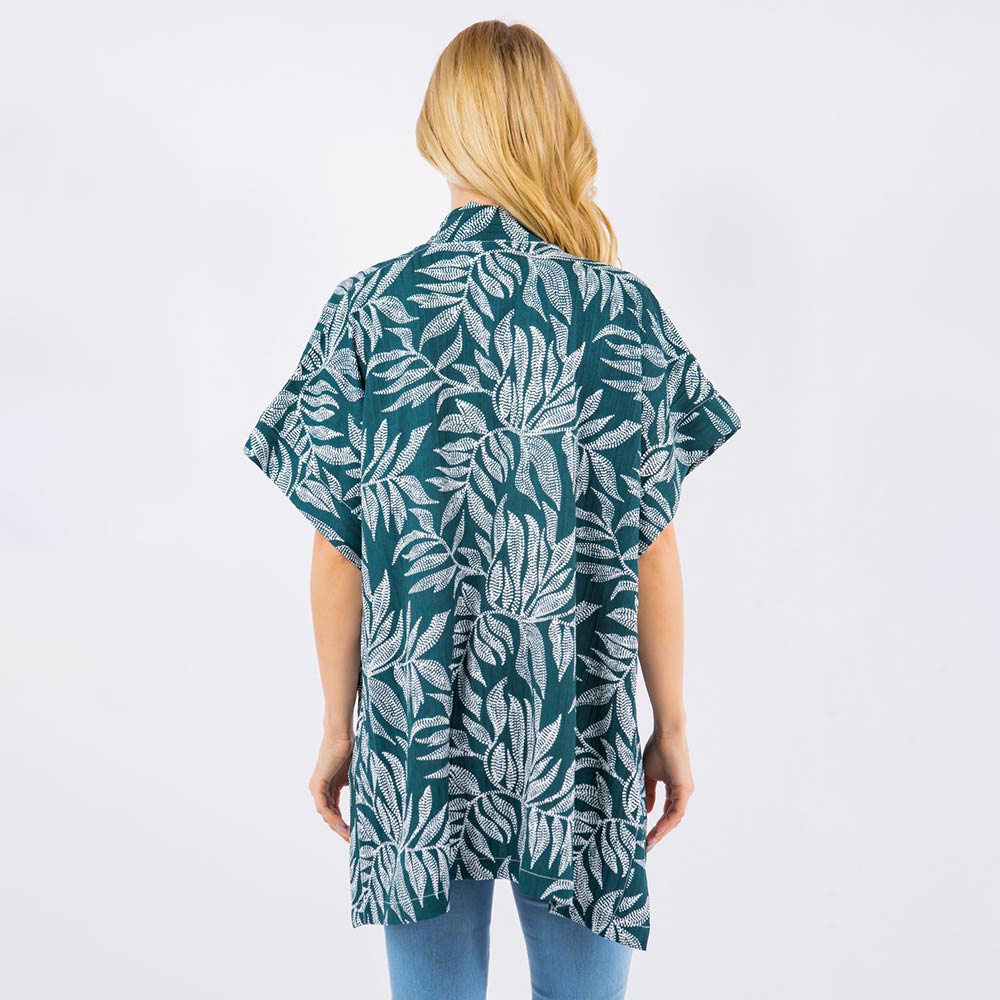 Lightweight Short Sleeves Leaf Pattern Open Front Kimono Poncho