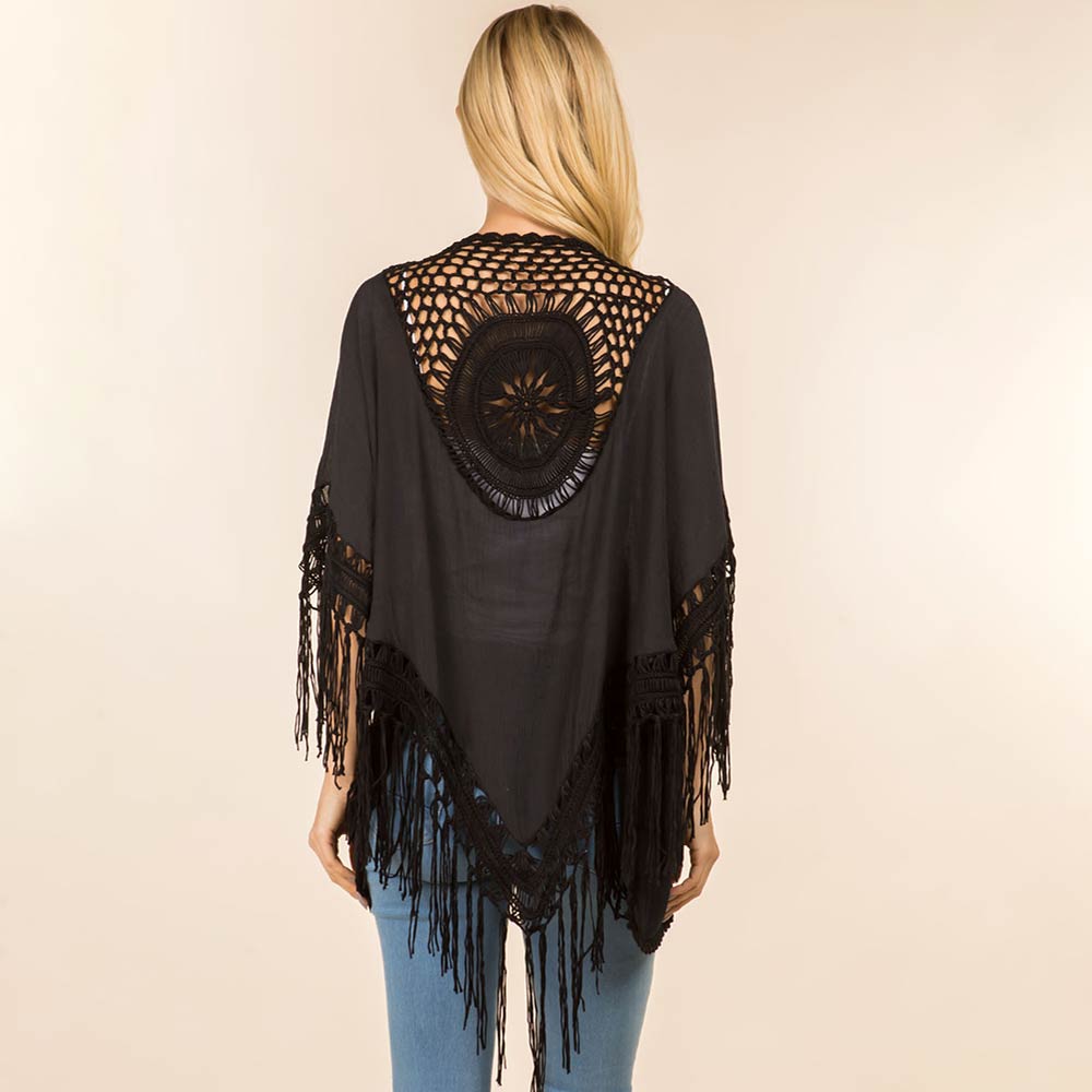 Open Front Fringe Embroidered Kimono Poncho Cardigan