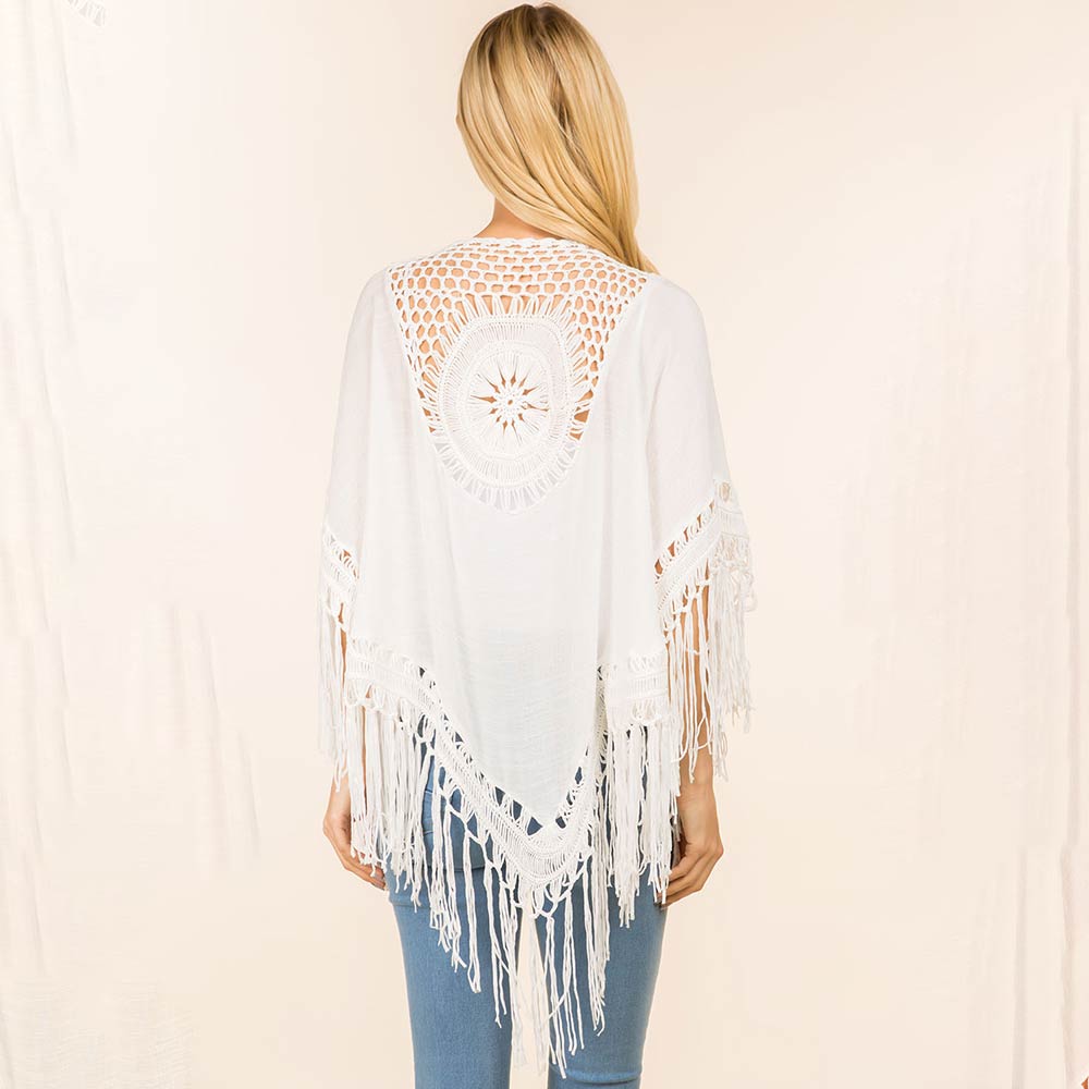• Open front kimono cardigan designed with soft drape, delicate trim, and flowing fringe accents for effortless layering. Ideal for styling over tanks or dresses, it adds movement, coverage, and a relaxed yet polished finish for everyday outfits, travel looks, and casual occasions.